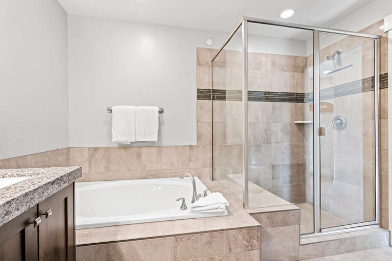 The second bedroom, located on the main level, features a comfortable queen bed and is conveniently located next to a full bathroom with a tub/shower combo, a lighted mirror, and a hairdryer. On the lower level, the third bedroom offers a full futon with a twin upper bunk, complete with an en suite bathroom, making it an ideal space for kids or additional guests.