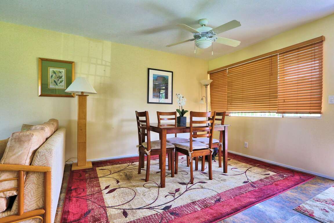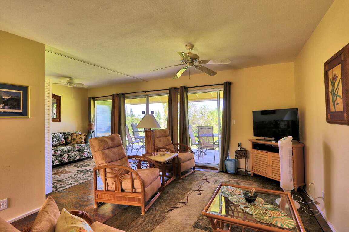 This property has tile flooring throughout, large open living area, large lanai, a master bedroom, with air-conditioning available and an on-suite bath. There is a sofa sleeper (new, deep queen mattress) in the den area, connected to the main living area, which has a retractable door that may be closed for privacy (almost like a 2nd bedroom!). Additional guest bath also provided. Relax and escape the heat with our newly installed air conditioned spilt systems, with one in the master bedroom and one above the sofa sleeper. Take your meals outside on the lanai and take in the gardens views of resort. Watch the golfers play and hear the local Hawaiian birds chirp away. In-unit washer/dryer provided. <br />