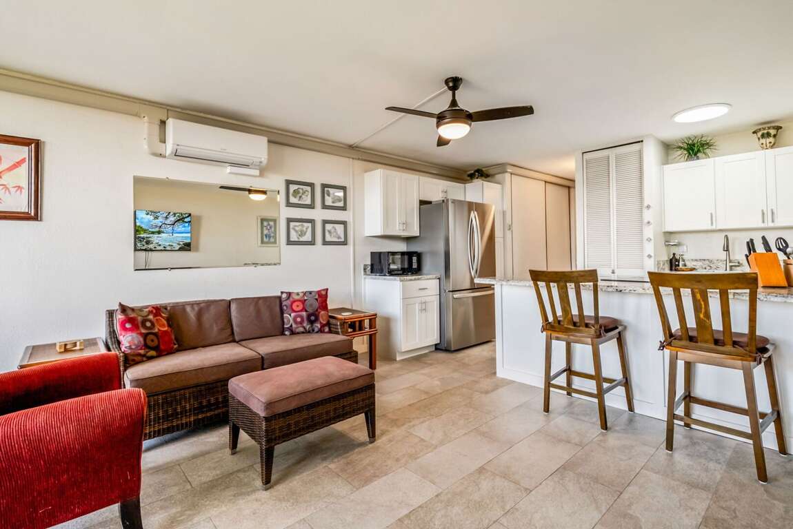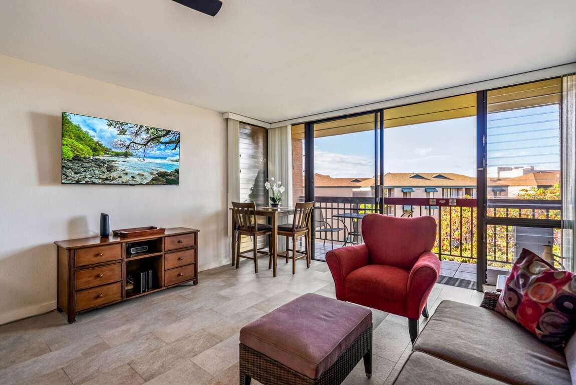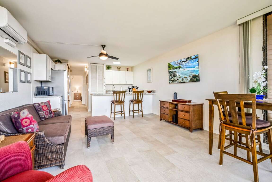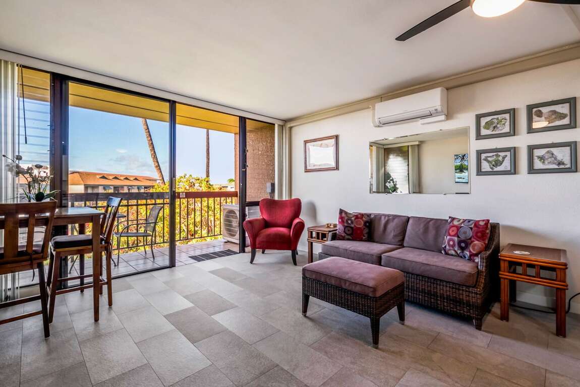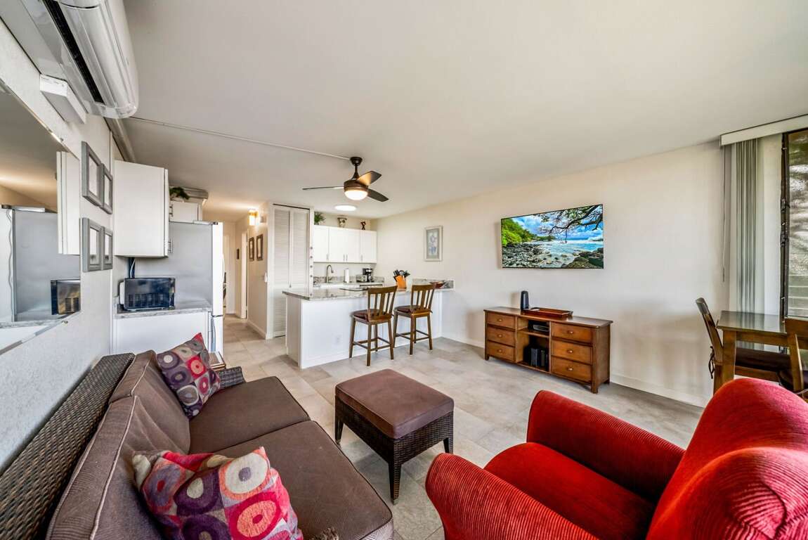As you step inside, you'll be greeted by a warm and welcoming ambiance, featuring a cozy living area that opens up to a private lanai with a partial ocean view. The condo comfortably accommodates up to four guests, with a spacious bedroom and a sofa bed in the living room, ensuring everyone has a restful place to unwind after a day of adventure.<br />