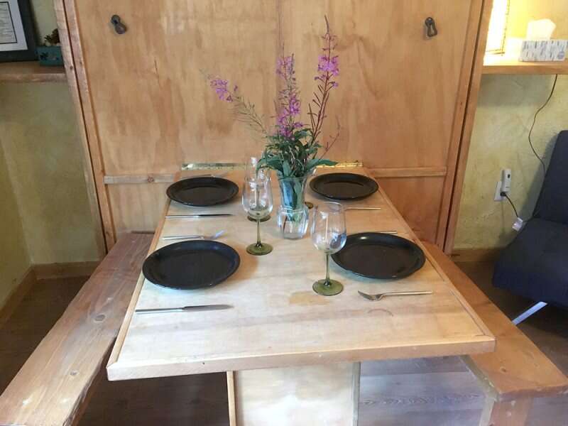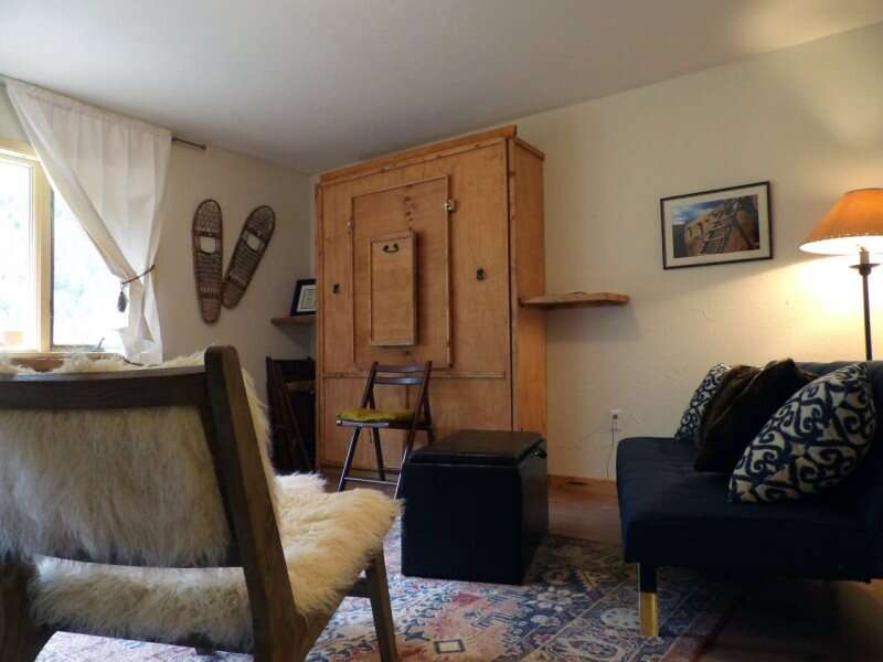 Soak in the mountains from the privacy of this lovely one bedroom condo, yet be close to all of the action that is Taos Ski Valley. Enjoy modern amenities and ski up convenience for a reasonable price with views that cannot be beat. With beautiful views of the mountains and plenty of room for a small family or couple to spread out, guests love the ski in convenience of this great condo. Room for 5 guests in two beds including a novel murphy bed that the kids will love. During the day the bed lifts into the wall revealing the dining room table. Simple and comfortable, this condo provides a very versatile space for you to enjoy. Full galley kitchen, one bedroom, two bath condo. Master bedroom has a private entrance and bath. Enjoy the warmth of an electric fireplace as you enjoy the expansive views. We look forward to your stay. All guests should have 4 wheel drive during ski season to get from the TSV parking lots to Snow Bear's parking lot. Call ahead to make arrangements if you know you won't have 4-wheel drive.