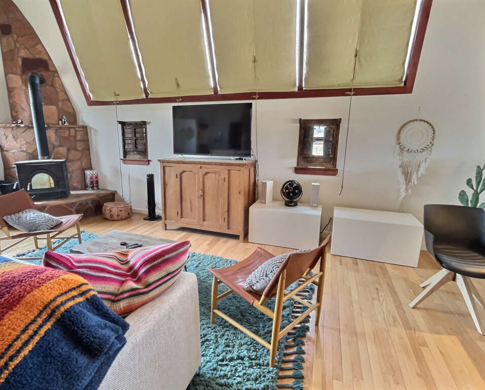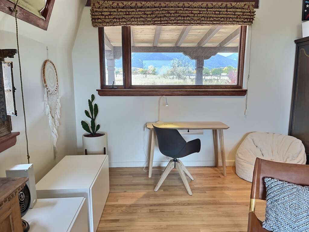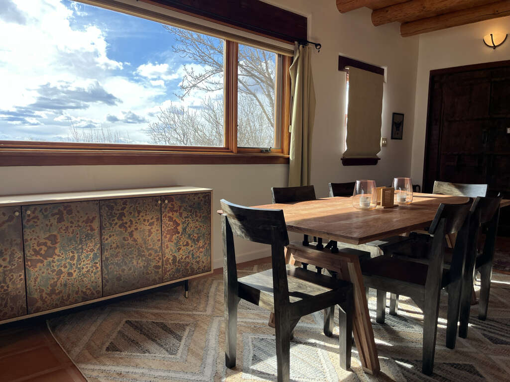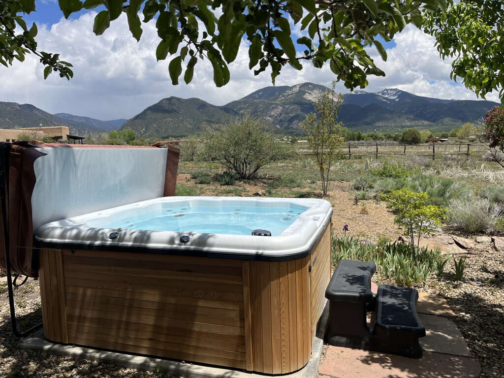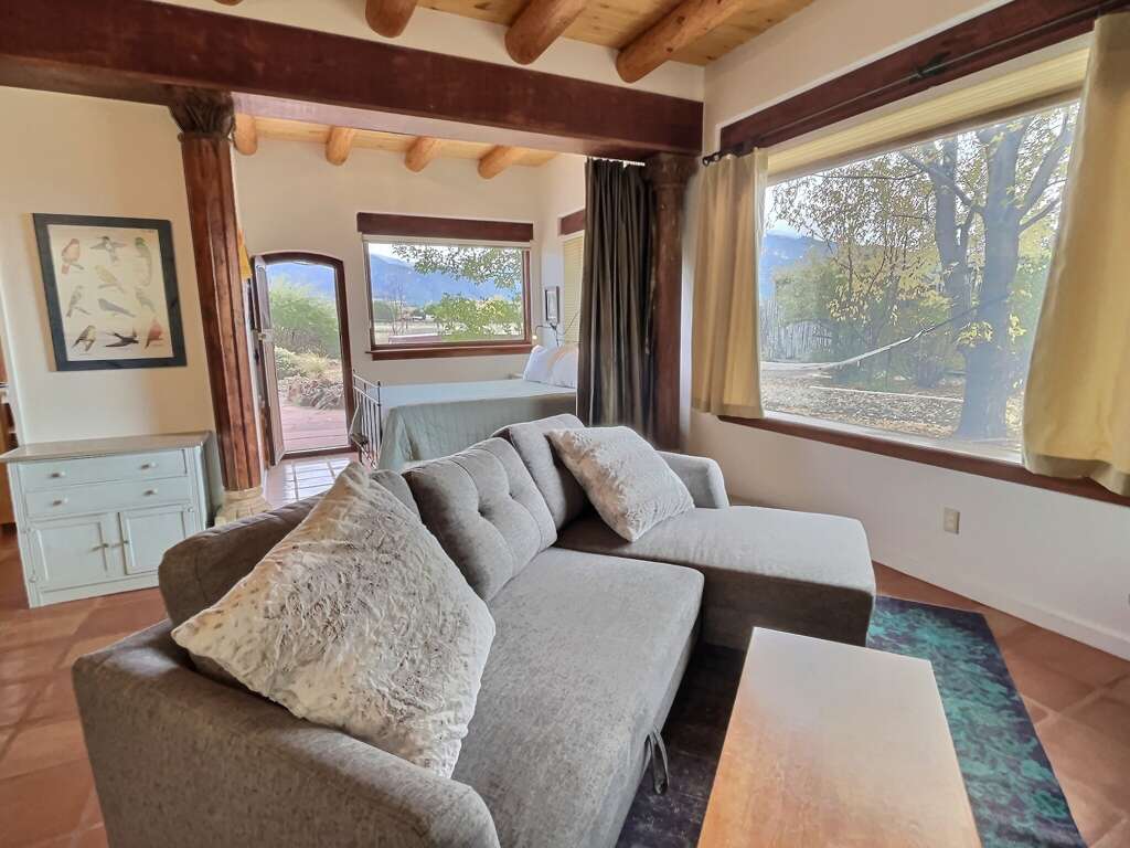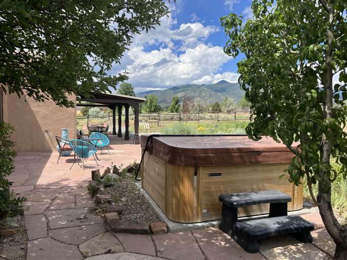 Get ready to explore the best of Arroyo Seco, Taos and Taos Ski Valley from this special perch perfect for a small family or two couples. The unique adobe home featuring several hand carved wood doors and other unusual architectural details sleeps 4 adults, or 2 adults and up to younger 3 children. It is situated on a private dirt road just minutes from the shops, galleries, and restaurants of quaint artisan Arroyo Seco. Newly furnished custom home is comfortable, private and well-appointed. Open floor plan means guests should all be comfortable with one another as the only doors in the house are for entry/exit and on the two bathrooms, or to separate two distinct living areas with bedroom using a set of large wooden doors.In the front space is a large living space, cafe dining space, desk and chair, loft sleeping space, kitchenette, and bathroom.Upstairs loft with queen bed is reachable only by a spiral staircase, so plan accordingly as the spiral staircase is not safe for young children or those with any balance or mobility issues. In the back side of the home is a full kitchen, large dining area, queen sleeping space with privacy curtain, sofa and fireplace, and a full bathroom with tub. The exterior features a large flagstone patio with sturdy patio furniture, gorgeous hot tub, covered portal and landscaped yard. The entry porch is stone and soaks up the sun in the afternoon so it's a great late day sitting porch, especially in fall and winter.Taos County Permit # HomeOCC-23-016