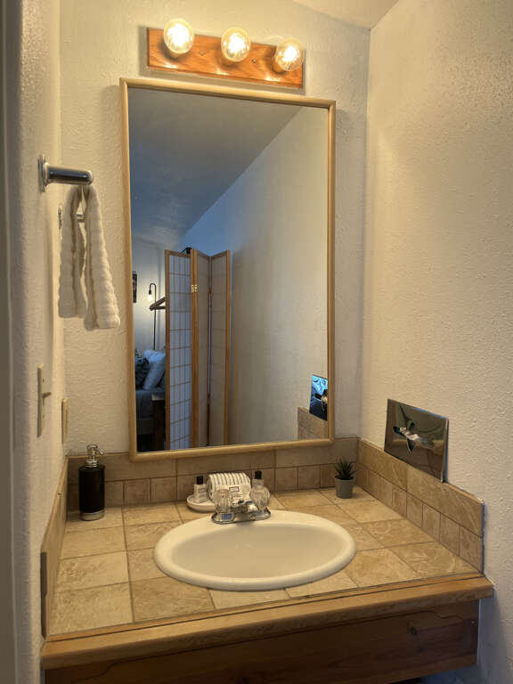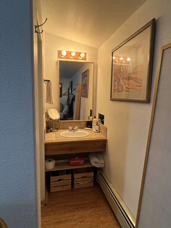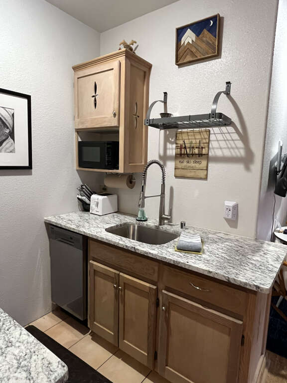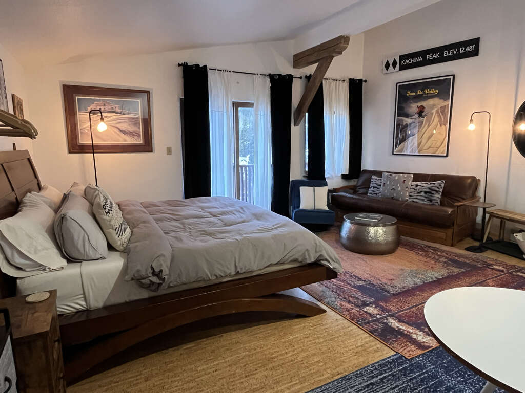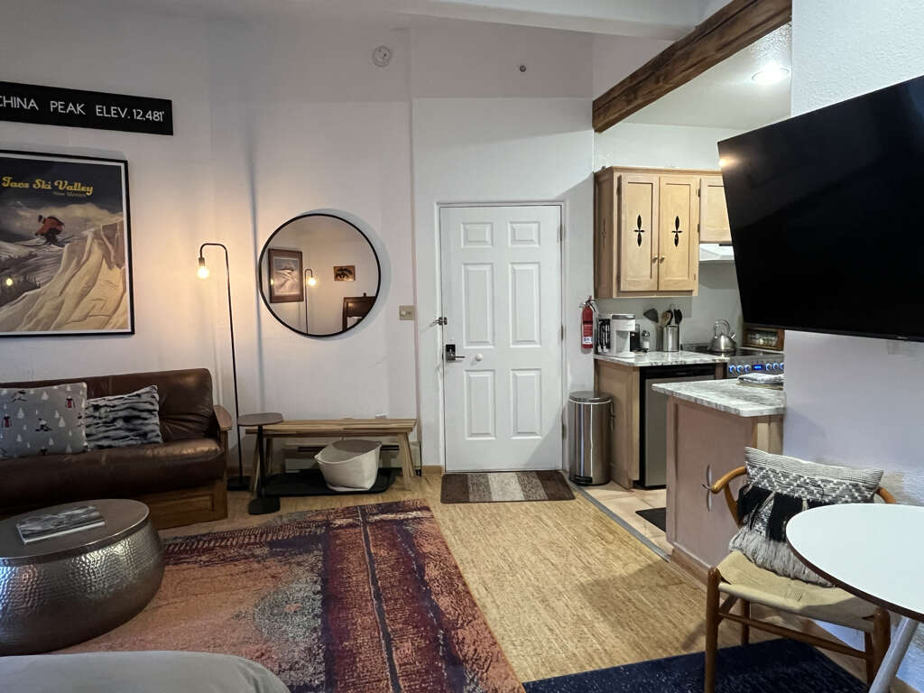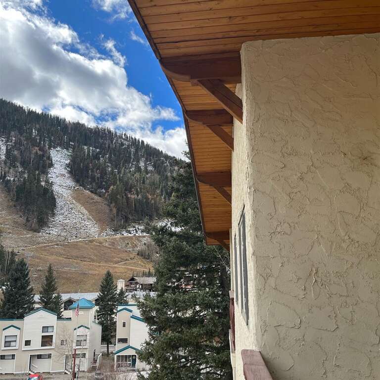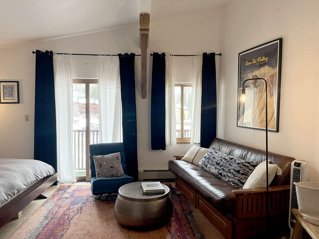 This modern studio condo is the perfect hotel alternative for powderhounds at Taos Ski Valley. The property is a 250 yard walk from lift one. With everything you need to cook and serve meals, to a beautiful bed and full bath with tub, and daybed seating which pulls out to two twins for sleeping, you're sure to feel well taken care of while you visit Taos Ski Valley. Located on a quiet top floor boasting a private balcony with mountain views and a peek at Lift One, you're sure to hit first chair each morning.Guests may drop off luggage in the loading zone at the property and then will need to drive one tenth of one mile to free public parking, there is also available designated overnight guest parking for one vehicle in an attended lot during ski season only.