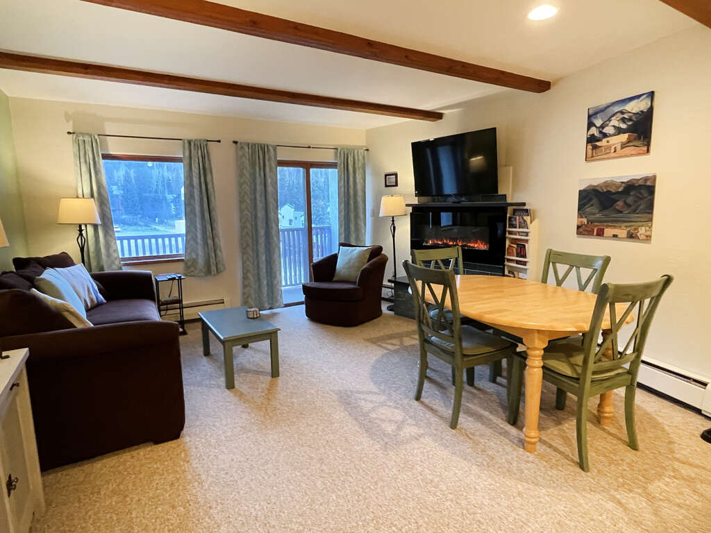 Abode Vacation offers this beautiful updated 2 bedroom 2 bath condo in the heart of Taos Ski Valley just a 3 minute walk to the base area and Lift 1 boasting comfortable beds, large smart TVs, Google home assistant, and on site ski locker storage. This walkup has an unloading area for guests, free overnight parking in Taos Ski Valley and this condo is just one quick flight of stairs up from the Lobby level.Guests may drop off luggage in the loading zone at the property and then will need to drive one tenth of one mile to free public parking, there is also available designated overnight guest parking for one vehicle in an attended lot during ski season only.