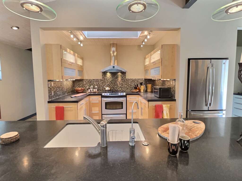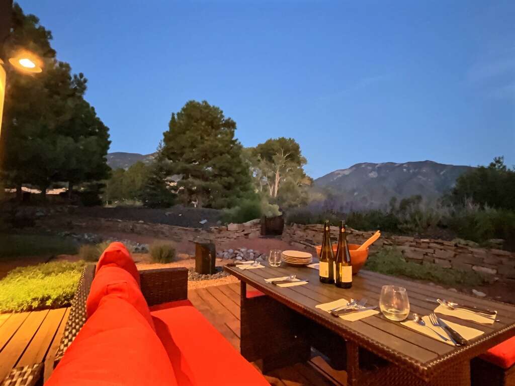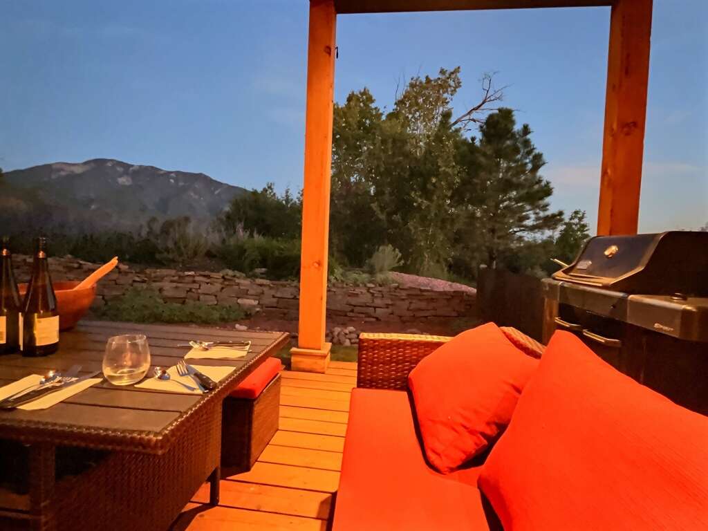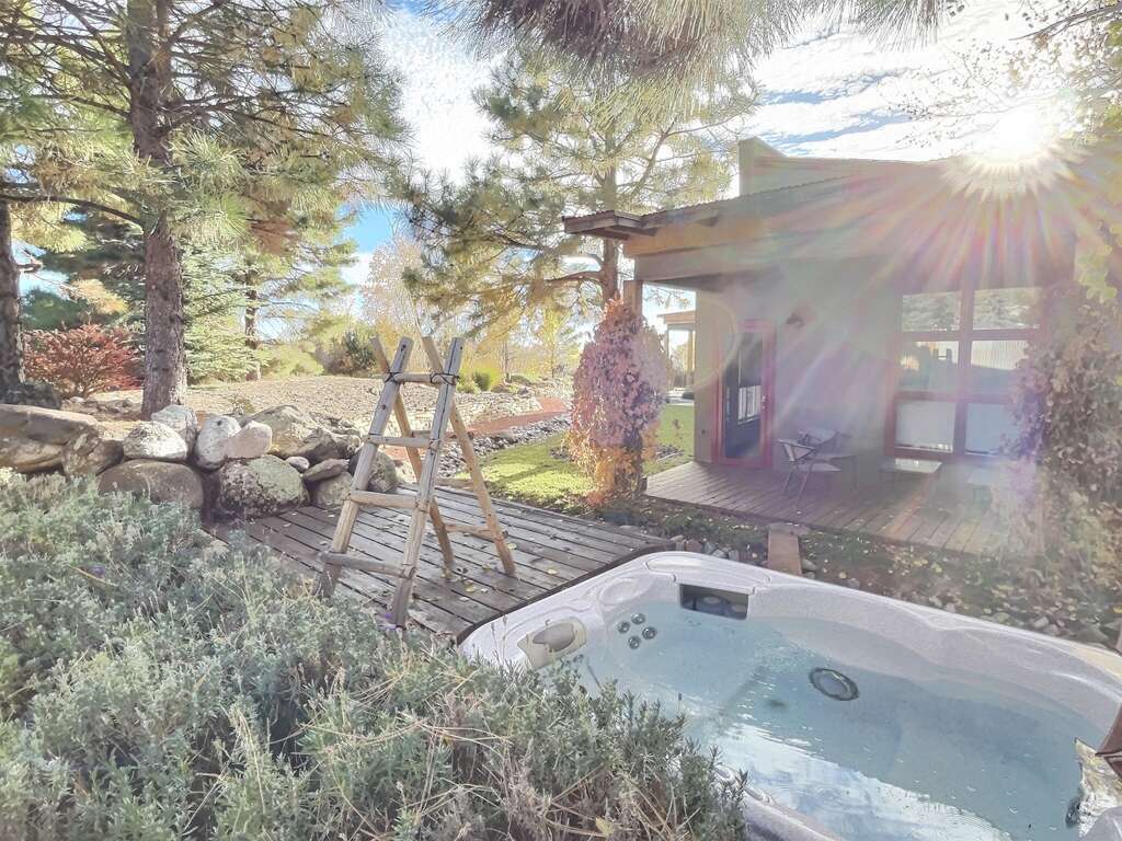 A well-designed house in Arroyo Seco with a gourmet kitchen, sun room views of El Salto, garden deck, and a private hot tub for a quiet vacation rental.