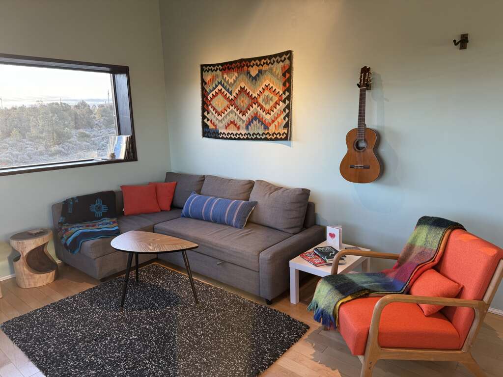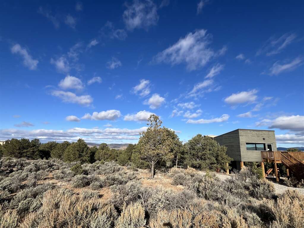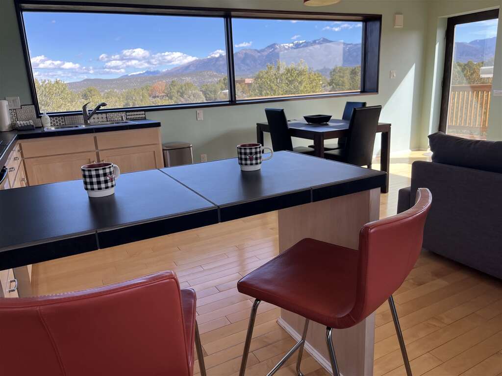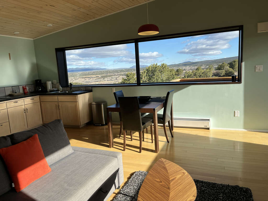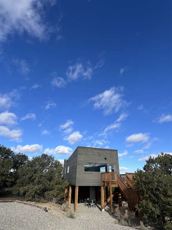 One of the few homes in Taos with air conditioning availableAmazing 360 Degree ViewsBeautiful Viewing DeckSunrise over the Sangre de Cristo Mountain RangeSunset over the Rio Grande Gorge15 minutes to Town of Taos25 minutes to Taos Ski ValleyRio Grande Gorge Recreation AccessHot SpringsSteam Room ShowerHand Made TilesLocal Douglas Fir wood claddingGravel driveway off paved road for easy access, parking spot for two vehiclesLaundry, iron/ironing boardGreen BuildingSky Nest is a locally designed and sourced green built home on the Hondo Mesa. Sky Nest offers an unparallelled natural setting to let you ground and connect in peace and privacy watching the clouds roll from the mountains out across the expanse of sage and juniper high desert lands, toward the rocky gashes leading down to the Rio Grande deep within its gorge. The living space is elevated above ground level to sit in the view. This home has one bedroom and one bathroom, a simple well-stocked kitchen for all your home cooking needs. The home is built on stilts and sits at 7,000 feet elevation with room for 1-4 guests.This ultra-efficient sanctuary lets you appreciate and savor the nature all around you. Eco-consciousness and comfortable, you'll love your stay here.Large picture windows perfectly frame 360 degree mountain views and flood the main room with warm light. Simple and elegant functional design makes this home relaxing and easy to operate. The living room includes a comfy sectional couch that contains a full-size sleeper sofa.Kitchen amenities: Induction 2-burner stove, extra large toaster oven for baking. Microwave, coffee maker, and blender. Easy 2-stool breakfast bar is a great place to catch up on email before getting the day's adventure going or enjoy a sit-down dinner at the dining table. Bluetooth speaker provided to amplify your favorite tunes.The Queen bedroom is at the back of the home with optional privacy provided by a large natural wood barn door. A private bathroom with steam shower with window provides total private relaxation.Enjoy time on the deck in every season watching the landscape, birds and butterflies out across the vista. An outdoor grill, dining table, string lights and and the stars above let you enjoy a little outdoor living space in addition to the interior of the home.Primary Suite: Queen Bed, Private Bath with Steam ShowerOther Sleeping Options: Full Sleeper Sofa in Living RoomDetails about the home:Designed by Joaquin Karcher of Zero E DesignStylish, eco-friendly designConstructed using blackened Douglas FirRainscreen facade claddingDouble wall construction with cellulose insulationLunos e2 Heat Recovery Ventilation SystemHandmade tiles fired in Mexico and designed by Ayse DesignThis home has mini-split air conditioning and heat system. The home is well-regulated and there are are very few hot days of summer. The electric baseboard heaters and a few electric portalble heaters will cut even the coldest chill during the winter.Taos County Permit ID: HomeOcc-24-056