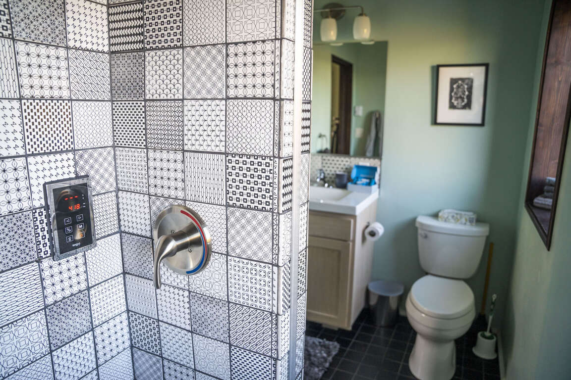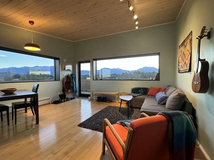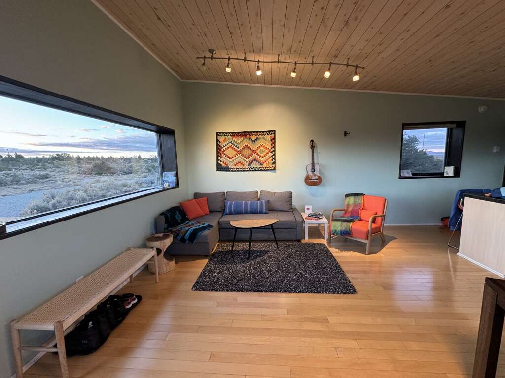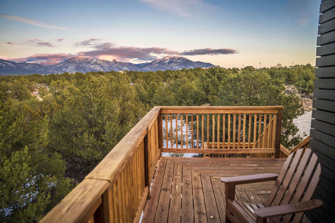 One of the few homes in Taos with air conditioning availableAmazing 360 Degree ViewsBeautiful Viewing DeckSunrise over the Sangre de Cristo Mountain RangeSunset over the Rio Grande Gorge15 minutes to Town of Taos25 minutes to Taos Ski ValleyRio Grande Gorge Recreation AccessHot SpringsSteam Room ShowerHand Made TilesLocal Douglas Fir wood claddingGravel driveway off paved road for easy access, parking spot for two vehiclesLaundry, iron/ironing boardGreen BuildingSky Nest is a locally designed and sourced green built home on the Hondo Mesa. Sky Nest offers an unparallelled natural setting to let you ground and connect in peace and privacy watching the clouds roll from the mountains out across the expanse of sage and juniper high desert lands, toward the rocky gashes leading down to the Rio Grande deep within its gorge. The living space is elevated above ground level to sit in the view. This home has one bedroom and one bathroom, a simple well-stocked kitchen for all your home cooking needs. The home is built on stilts and sits at 7,000 feet elevation with room for 1-4 guests.This ultra-efficient sanctuary lets you appreciate and savor the nature all around you. Eco-consciousness and comfortable, you'll love your stay here.Large picture windows perfectly frame 360 degree mountain views and flood the main room with warm light. Simple and elegant functional design makes this home relaxing and easy to operate. The living room includes a comfy sectional couch that contains a full-size sleeper sofa.Kitchen amenities: Induction 2-burner stove, extra large toaster oven for baking. Microwave, coffee maker, and blender. Easy 2-stool breakfast bar is a great place to catch up on email before getting the day's adventure going or enjoy a sit-down dinner at the dining table. Bluetooth speaker provided to amplify your favorite tunes.The Queen bedroom is at the back of the home with optional privacy provided by a large natural wood barn door. A private bathroom with steam shower with window provides total private relaxation.Enjoy time on the deck in every season watching the landscape, birds and butterflies out across the vista. An outdoor grill, dining table, string lights and and the stars above let you enjoy a little outdoor living space in addition to the interior of the home.Primary Suite: Queen Bed, Private Bath with Steam ShowerOther Sleeping Options: Full Sleeper Sofa in Living RoomDetails about the home:Designed by Joaquin Karcher of Zero E DesignStylish, eco-friendly designConstructed using blackened Douglas FirRainscreen facade claddingDouble wall construction with cellulose insulationLunos e2 Heat Recovery Ventilation SystemHandmade tiles fired in Mexico and designed by Ayse DesignThis home has mini-split air conditioning and heat system. The home is well-regulated and there are are very few hot days of summer. The electric baseboard heaters and a few electric portalble heaters will cut even the coldest chill during the winter.Taos County Permit ID: HomeOcc-24-056