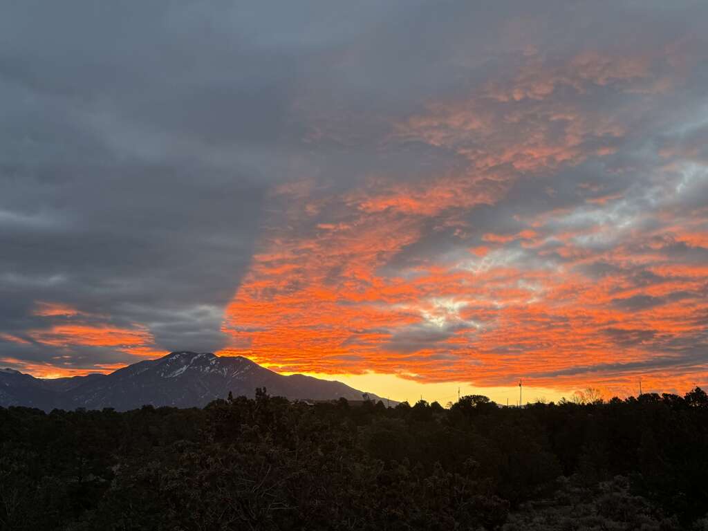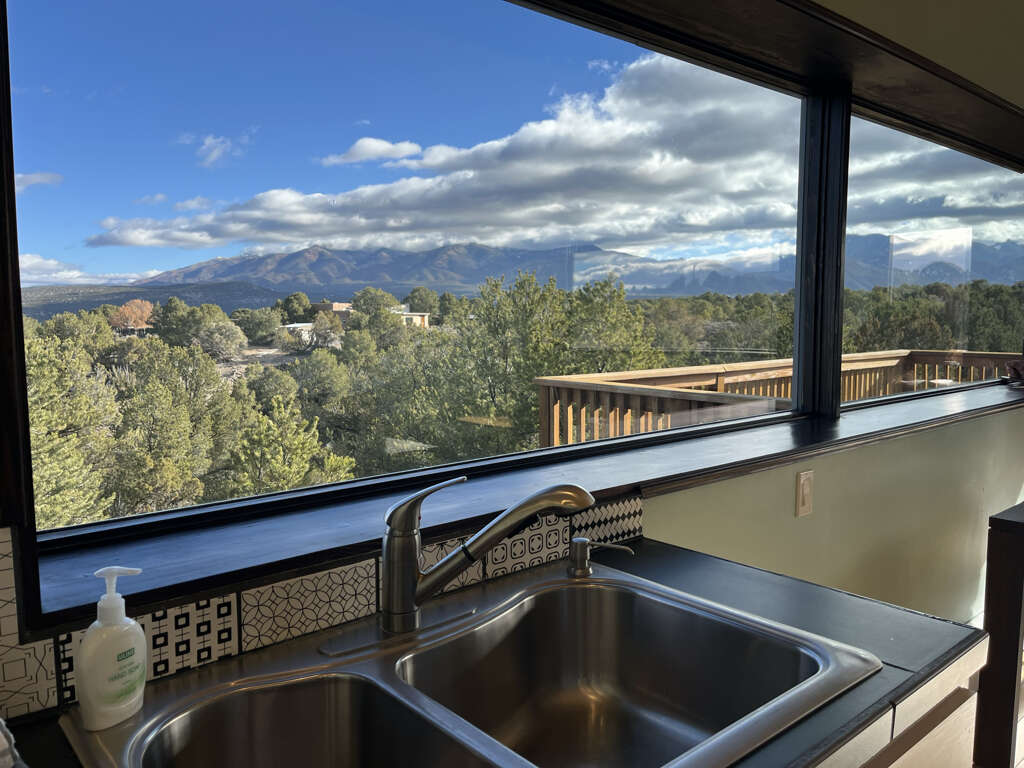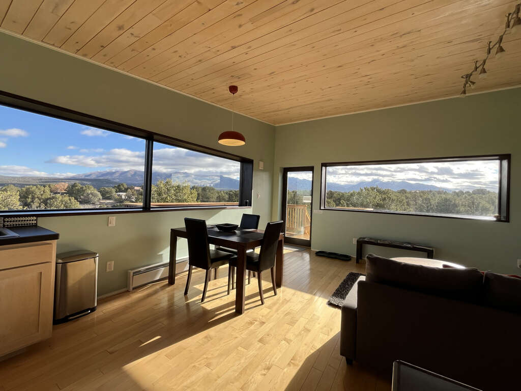 Green-built house on Hondo Mesa near Taos, NM, a quiet place to stay with 360° mountain views, a viewing deck, steam shower, and mini-split AC.
