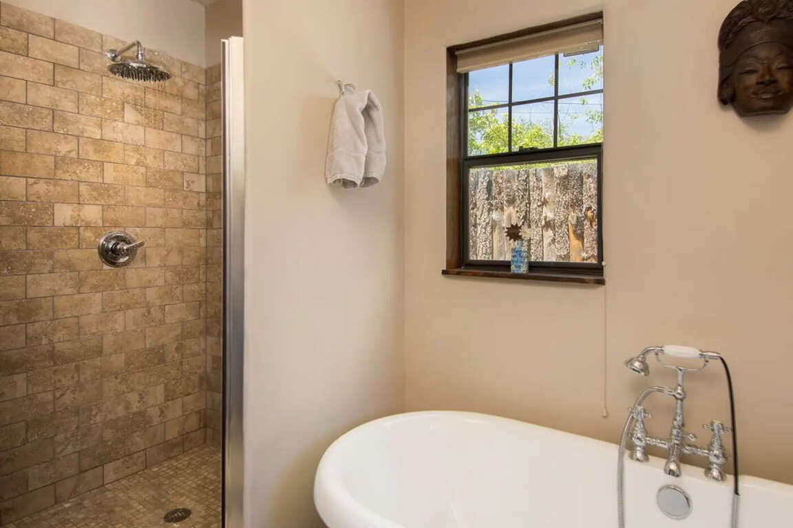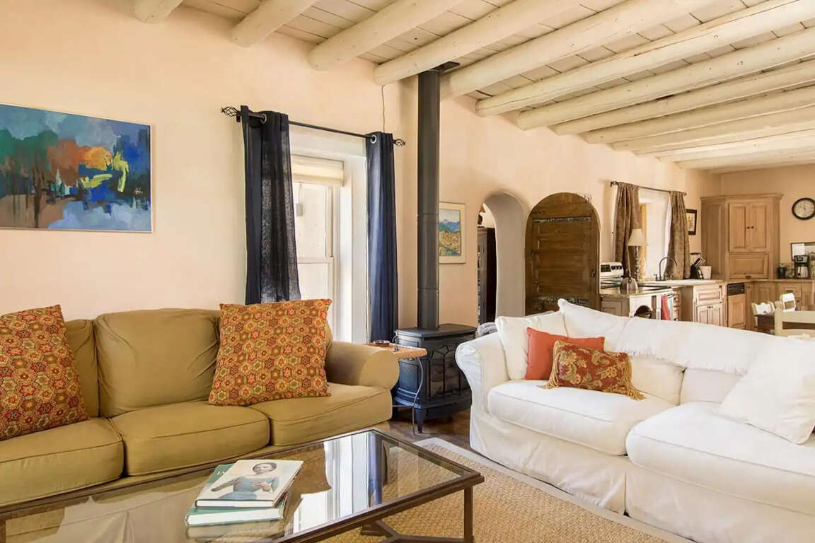 Light-filled adobe house in Taos with a modern kitchen, gas fireplace, AC, WiFi, and a flagstone patio hot tub, set on a fenced half-acre.
