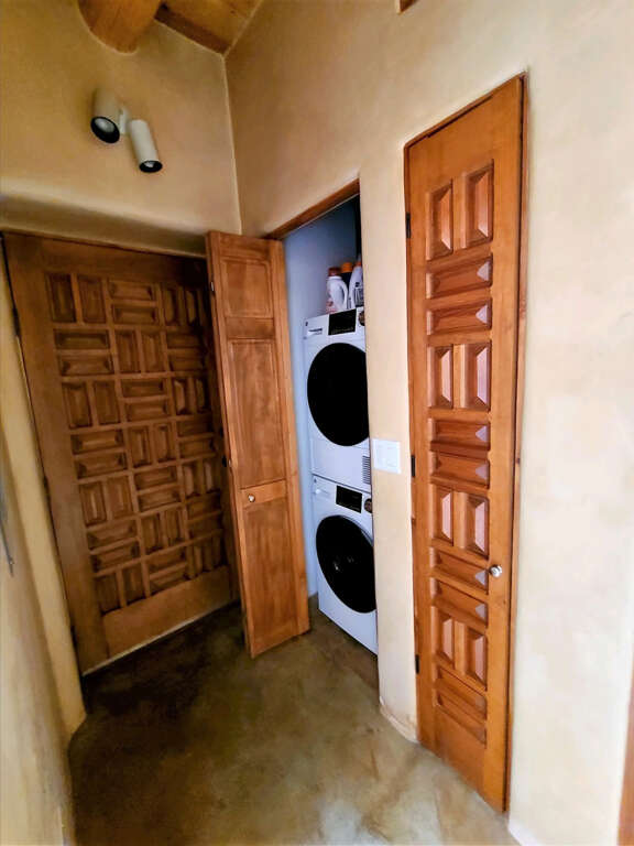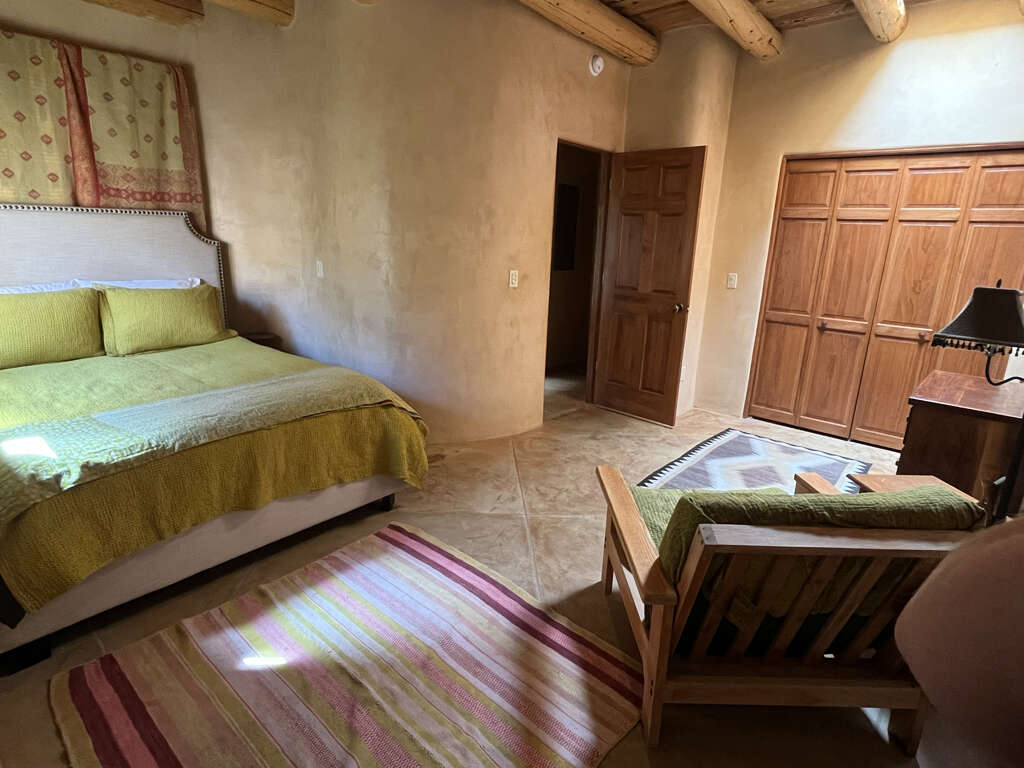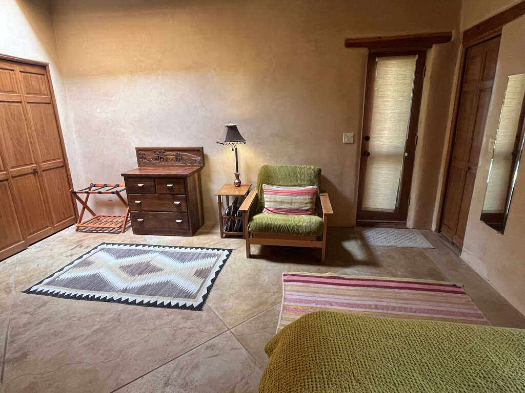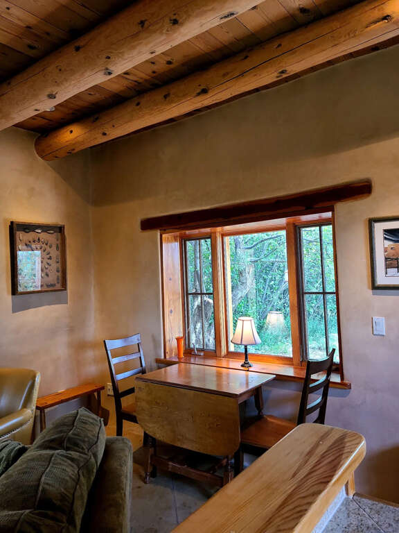 The home is a classic Taos Adobe that has been completely refurbished with lots of love. The open kitchen and living area and its kiva fireplace and plaster walls feels so inviting. The patio doors open from the living area out to a patio and secret garden in summer, or a snowy wonderland in winter. The private areas include the spacious bedroom with a queen size bed, sitting area, and an adjacent full bathroom with tub and shower. The kitchen is fully equipped. The washer/dryer is neatly tucked into a closed opposite the bathroom. Although only 740 sq ft, the home has an open and airy feeling with lots of outdoor space and so close to Taos Ski Valley and great restaurants and shops in Arroyo Seco and El Prado.