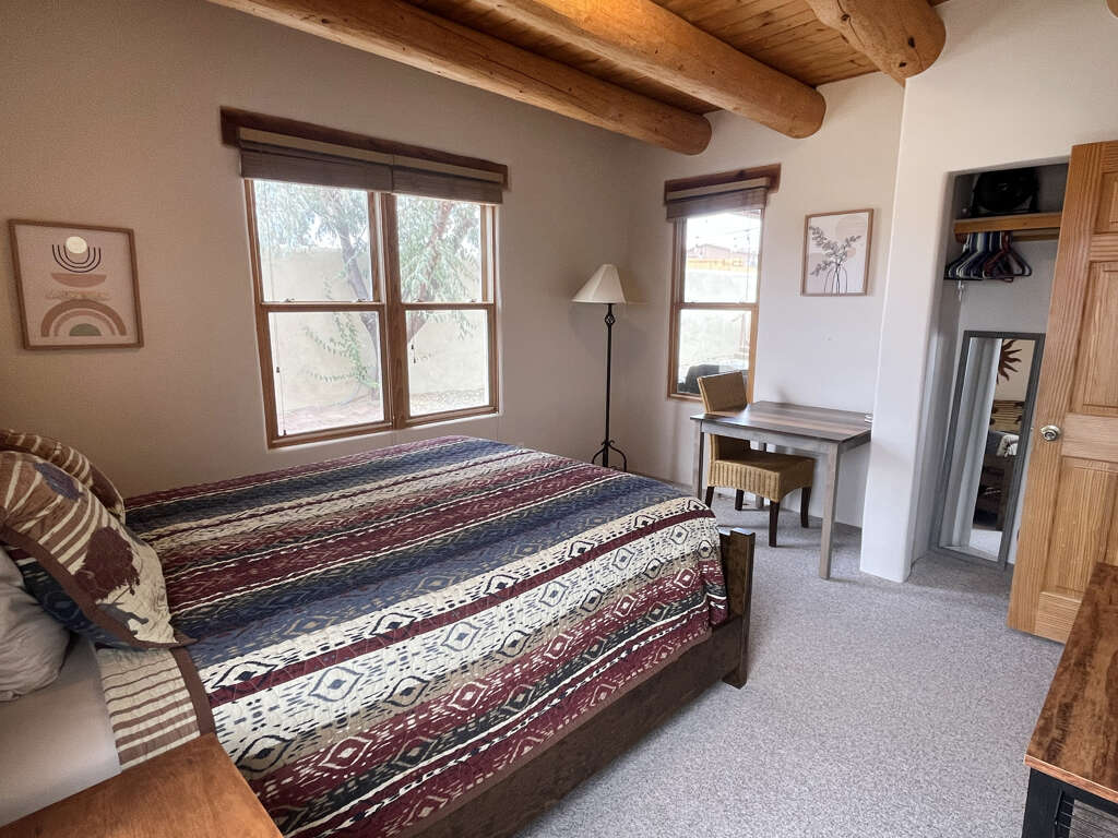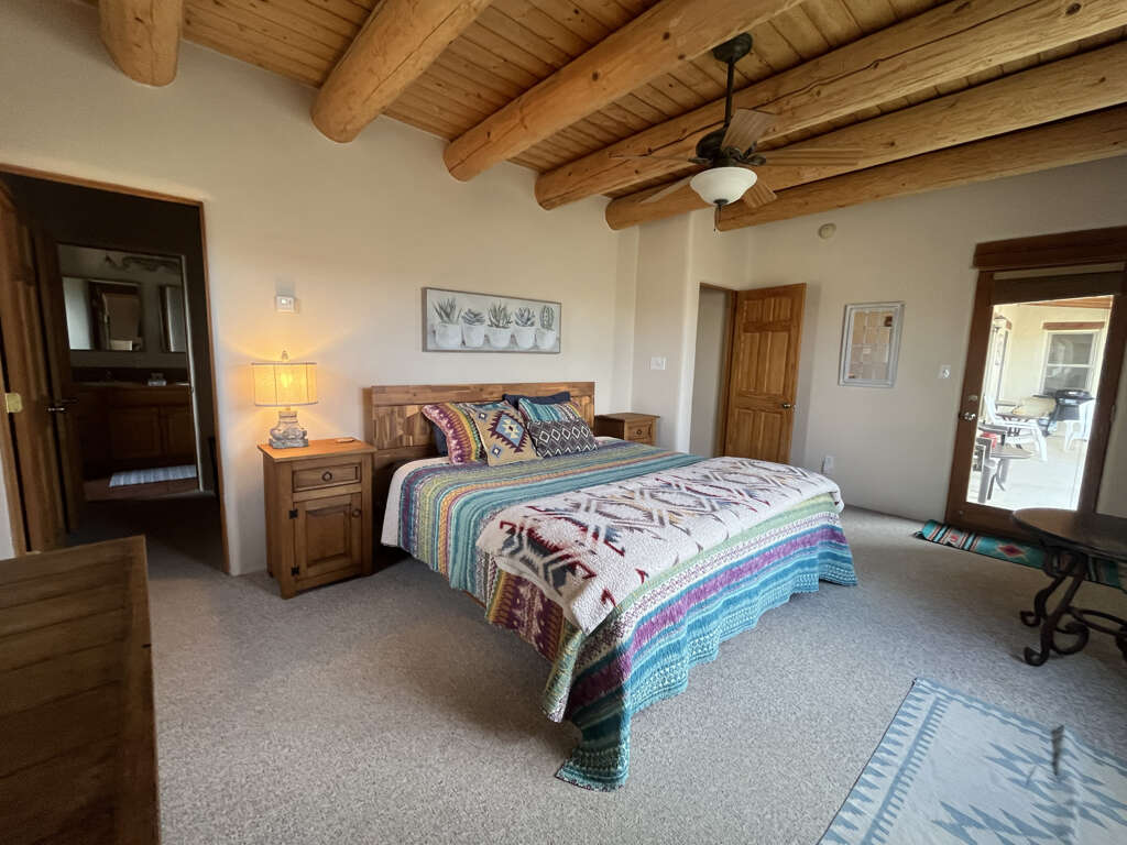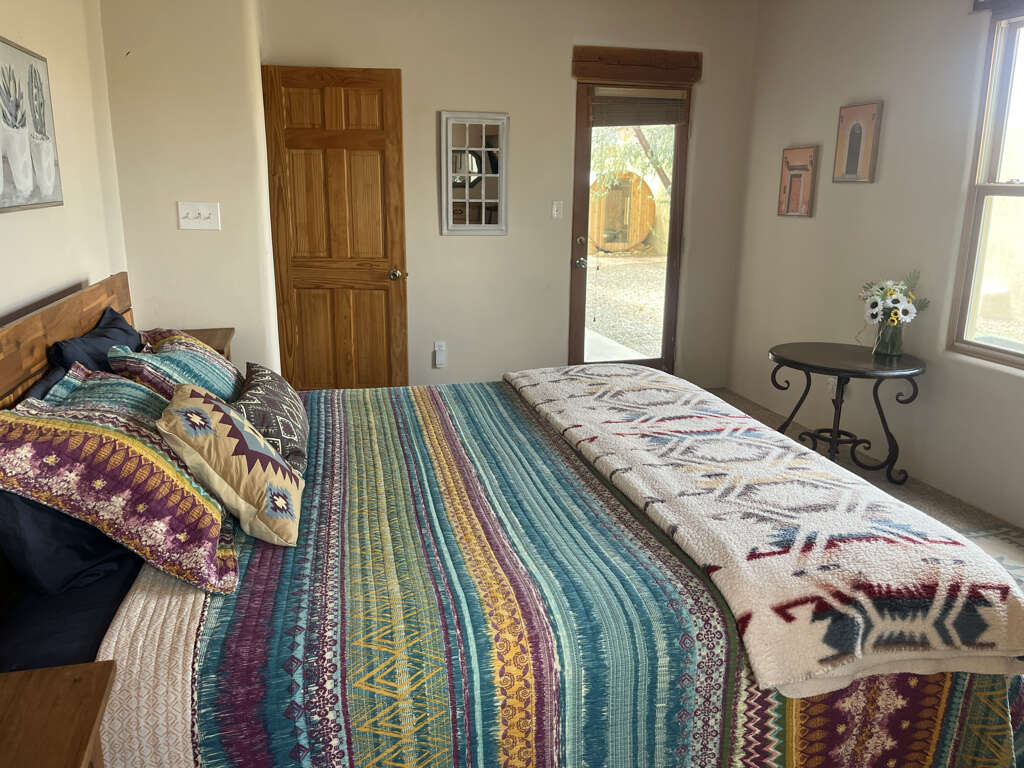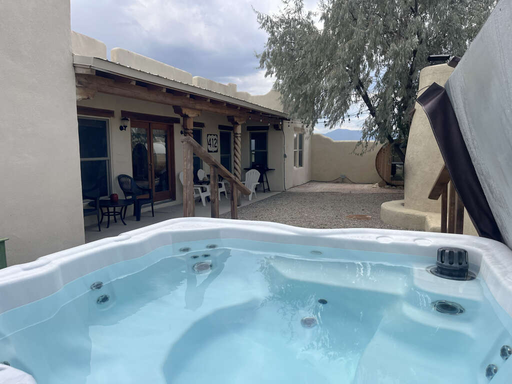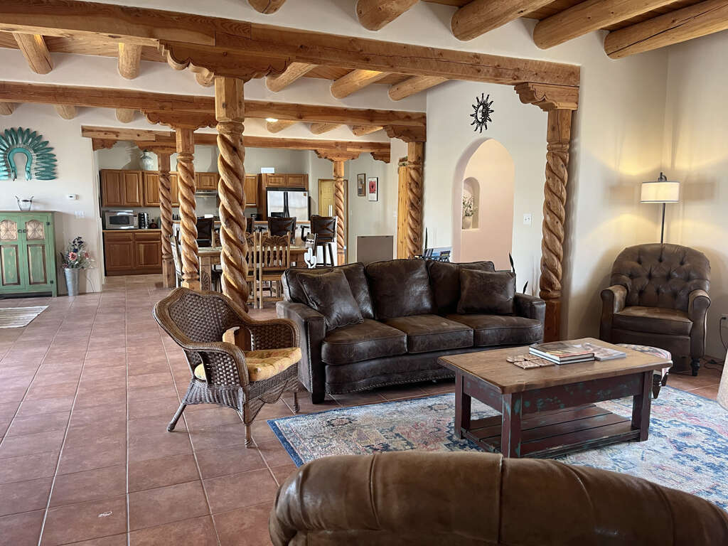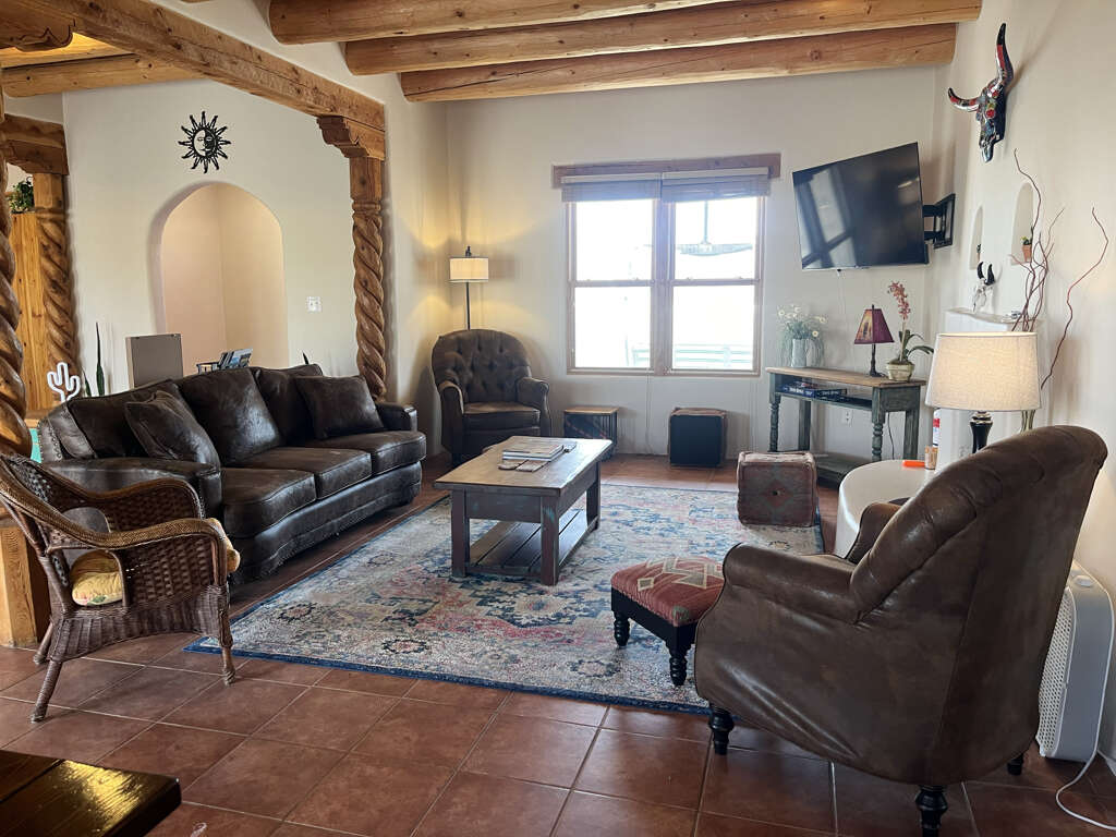 House in El Prado near Taos with open-concept living, two adobe-walled patios, a king suite, and a private back patio with hot tub and sauna.