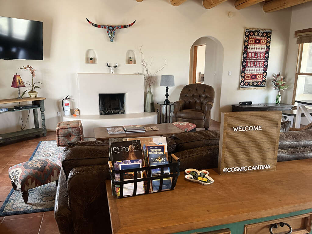 Perfect for families or friends trips, Cosmic Cantina boasts a great floor plan with huge open concept living, dining and kitchen area opening out on two sides to two large adobe walled patios. On one side of the living areas you'll find two bedrooms and one full bath. Off the kitchen on the other end of the home you'll find the king suite, with walk in closet and full bathroom with shower and soaking tub. The home also features hot tub and sauna, gas grill and seating on the private back patio, as well as laundry room/mud room for gear and a carport for parking. You'll love the convenience of getting to Taos, Arroyo Seco and Taos Ski Valley from this home.Taos County Short Term Rental Permit ID: STR-2025-0071