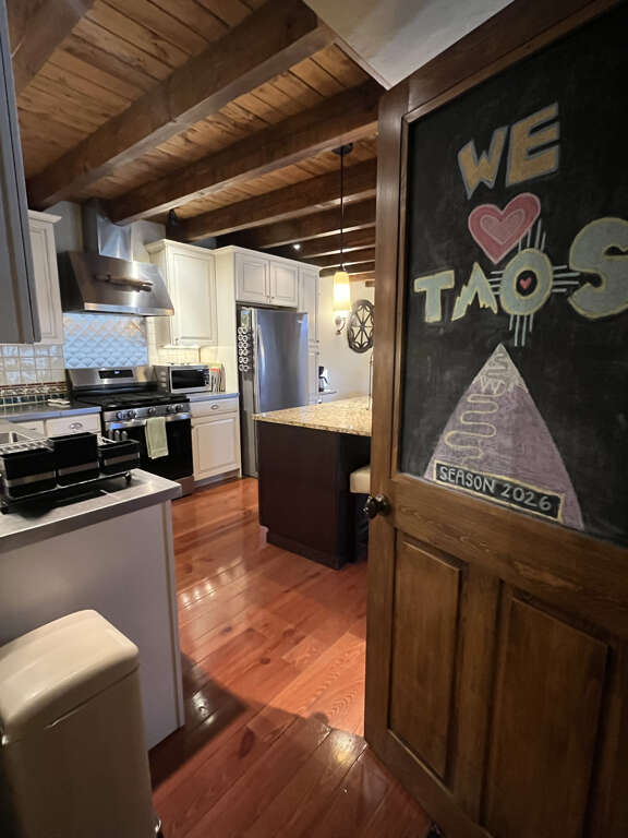 It's really hard to beat a beautifully-designed modern built ski chalet like this home. It's a perfect example of modern-meets-rustic situated on the mountain in the resort, a half mile from the base area village. With three bedrooms, a roomy loft with extra sleeping spaces, three bathrooms and an incredible open concept living, dining and kitchen area that opens on to a gorgeous viewing deck where you can sip your favorite beverage and listen to the relaxing sounds of the Rio Hondo flowing - this home has room to accommodate one large or two or three smaller families staying together.4WD is necessary to access the house in winter due to steep dirt road and driveway and it is best to park max 2 vehicles in the driveway in winter. Three vehicles may work in summer, depending on size. Overflow parking is available in the Taos Ski Valley public lots.Must be over 30 years of age to rent this home at time of booking. In addition to completing a booking and payment, valid ID must be provided, a rental agreement must be signed and security deposit or damage hold must be paid with valid credit card after booking.