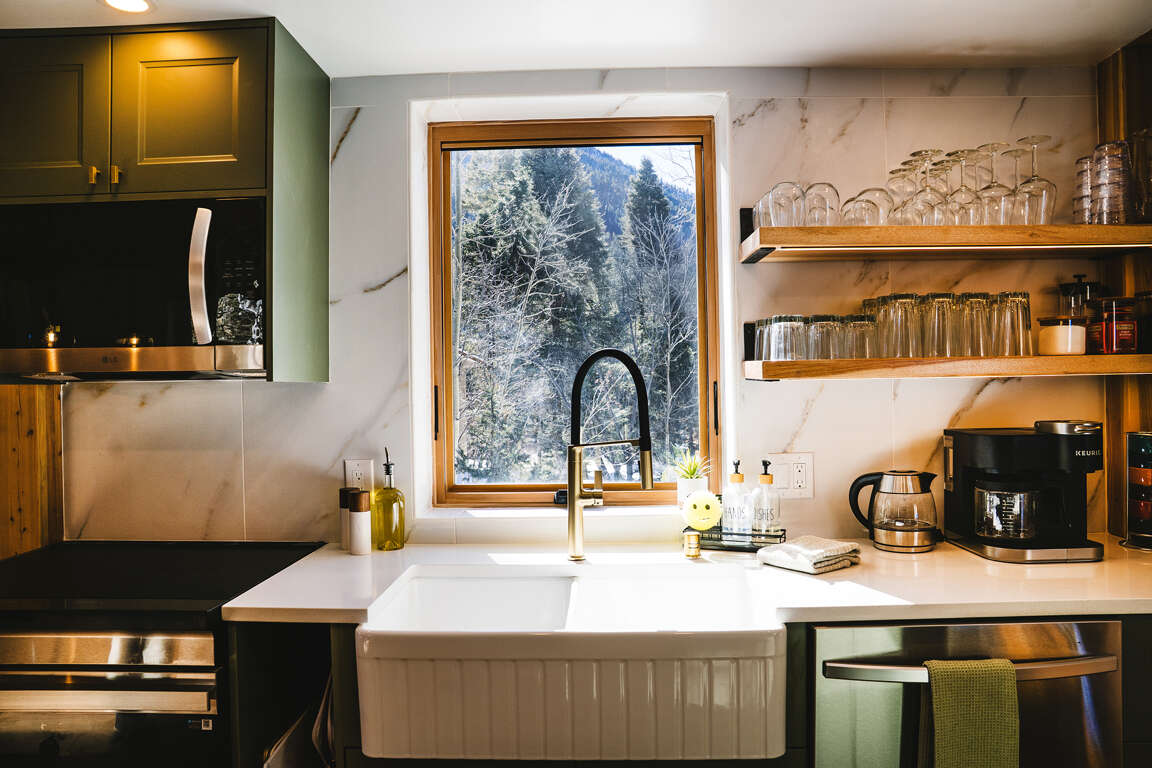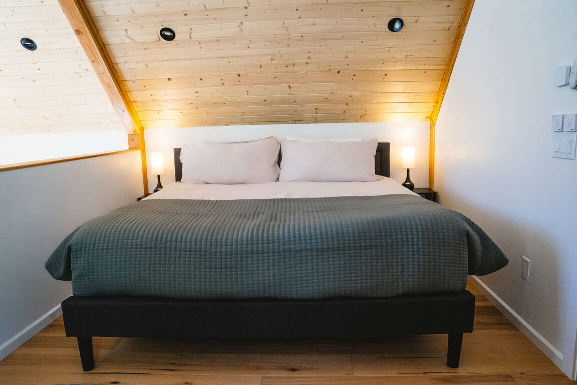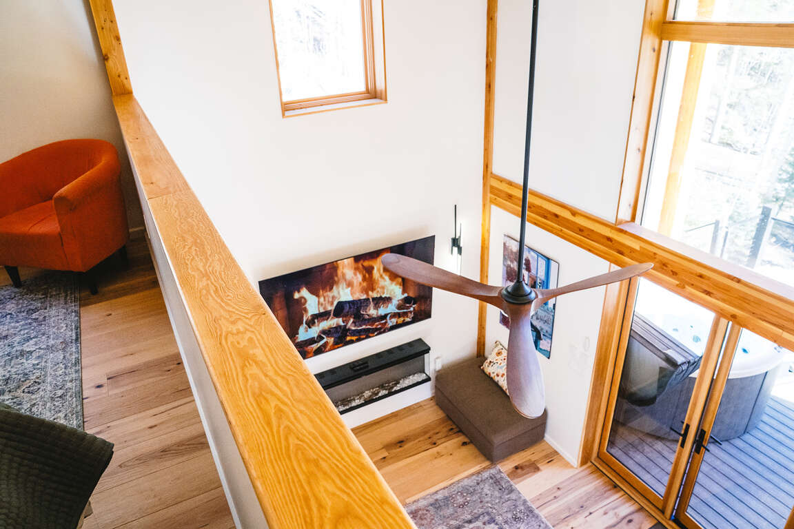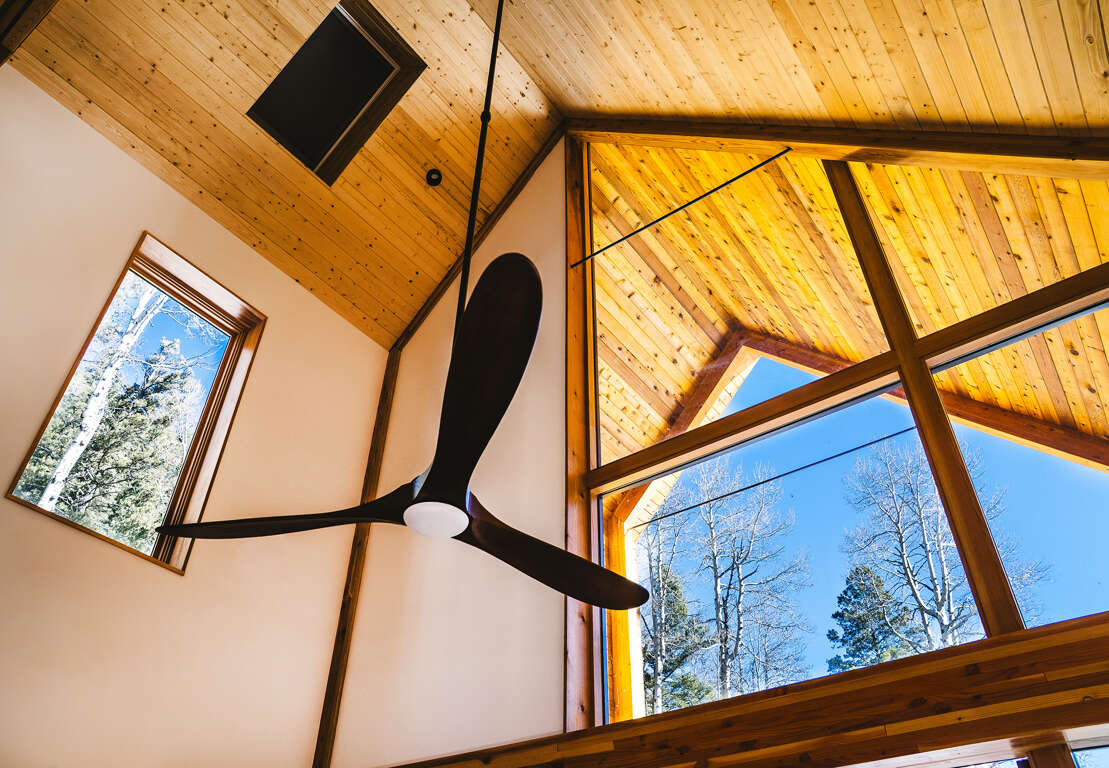 Stay in the heart of the mountain in Taos Ski Valley in this gorgeous modern cabin brimming with smart design, cozy touches and functional details.On the main level of the house is a picturesque deck with round hot tub facing the mountain views which opens into a bright, spacious living area with fireplace and 65" smart TV. High asymmetrical wood ceilings create a vaulted space of warm natural tones. The living level also includes a dining area with sturdy bespoke wood table and chairs and sideboard. A modern kitchen with everything you need to cook and enjoy meals and entertain. Up the wood staircase you'll find two bedrooms with king beds; one loft space open to the living level below, and one private bedroom with a powder bath between them. On the ground level, find the entertainment area with 42" smart tv with apple tv and bean chairs. The bedroom in this space has four built in bunks with personal reading lights and wood paneling. Also on this level is the laundry and lots of gear storage. This is the main entry area to the house from the driveway to make it easy to offload the day's adventures and come in and get comfortable.