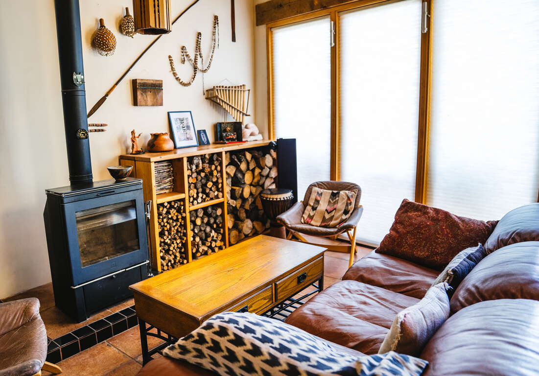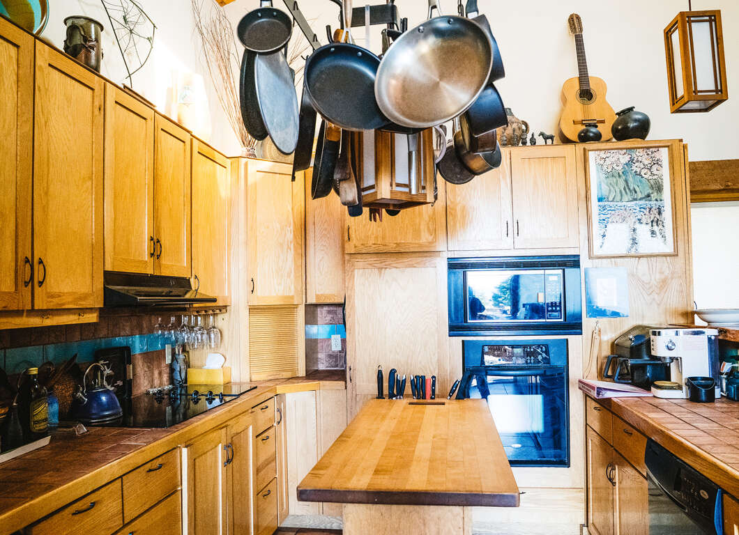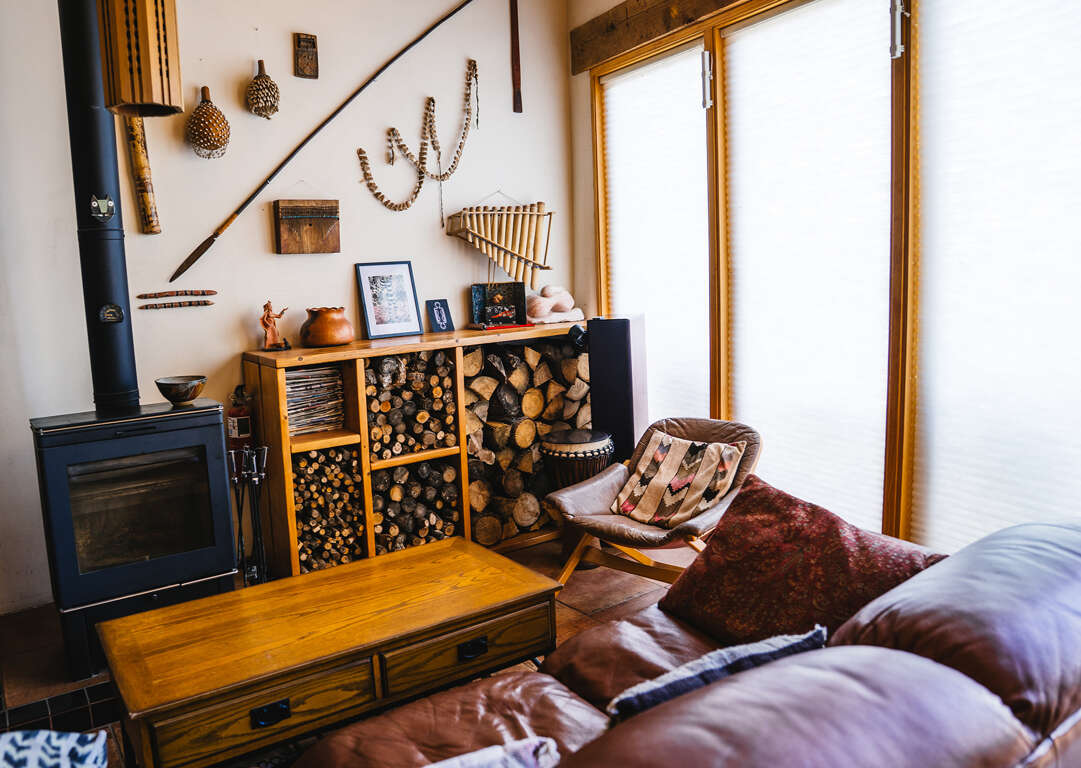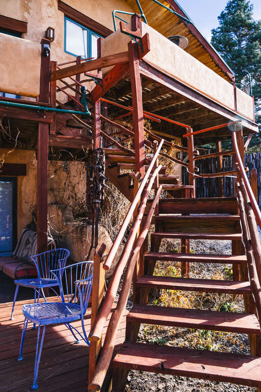Three-level house in Taos with private decks, skylights, and a wood stove, offering a practical vacation rental for winter stays and remote work.