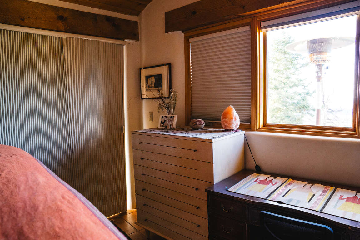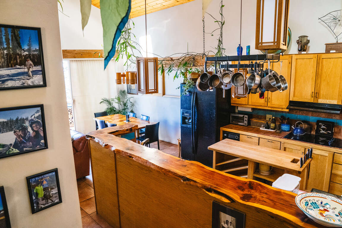A 2 bedroom 2 full bathroom home with three living levels, driveway, private decks, huge picture windows, skylights, and a wood burning stove. Perfect place to relax this winter for an extended stay in Taos.Enter on the main level into the open concept living area with fully stocked kitchen, dining table, tv, stereo and wood burning fireplace/stove. Head upstairs to the king bedroom with balcony and full bathroom with standing shower and jaccuzzi tub. Or head downstairs to the queen bedroom with office and second full bathroom.
