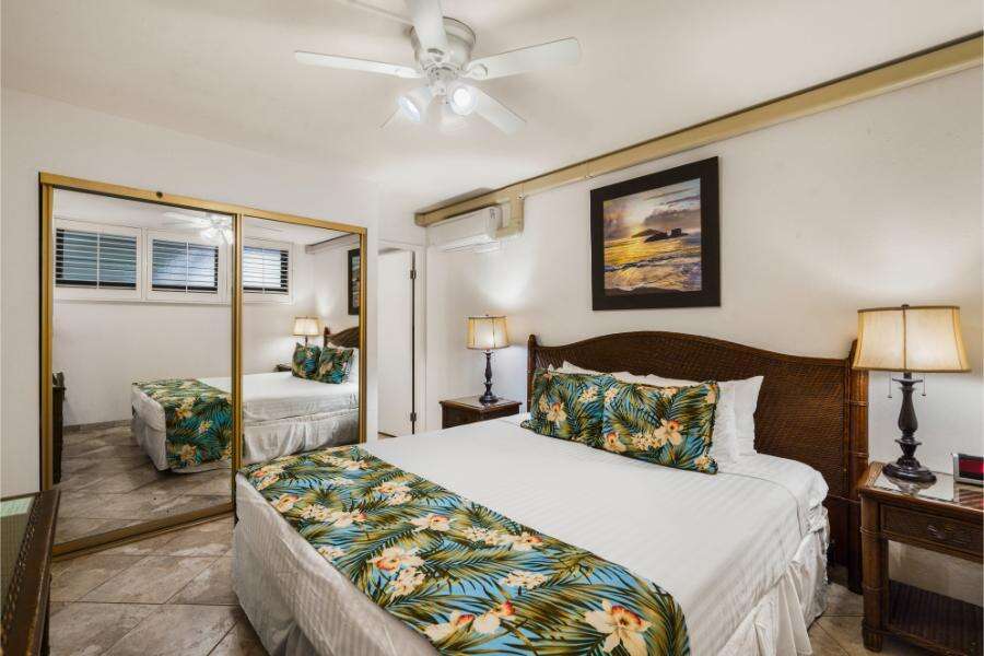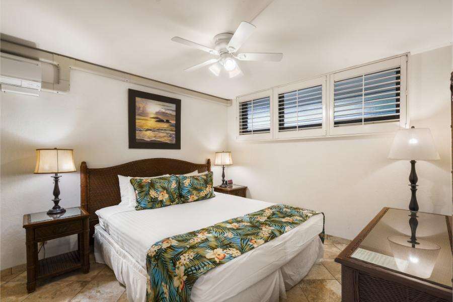 This unit sleeps up to four guests and features a king bed in the master bedroom and a convertible sofa bed in the living room. Ceiling fans and split-duct air conditioning in both the bedroom and living room help maintain a cool environment throughout the day. The fully equipped kitchen and spacious lanai offer the ideal setup for oceanfront dining or relaxing after a day of island adventure.