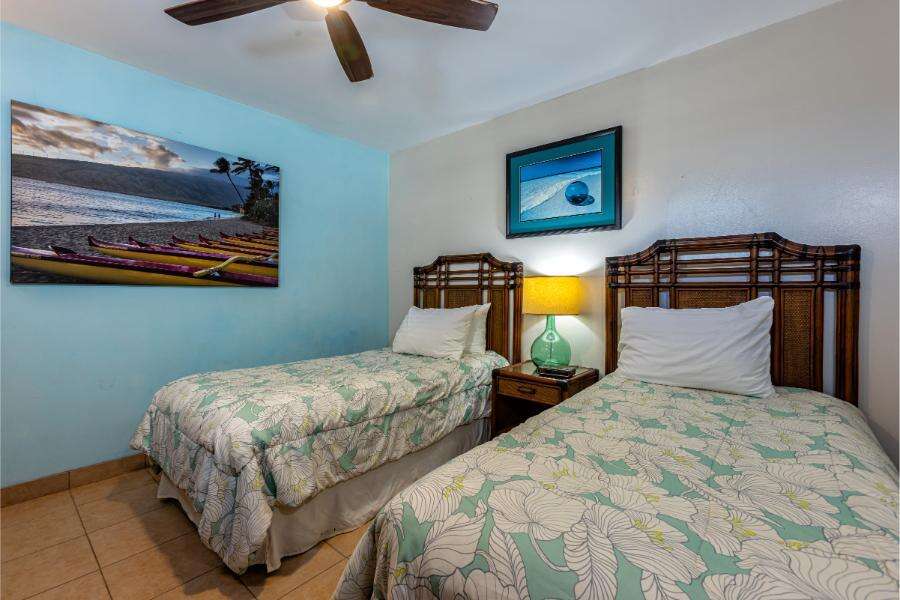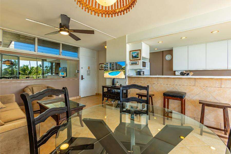 Kamaole Nalu #404 is a spacious two-bedroom, two-bathroom condo offering ocean views and a relaxing island atmosphere. Located on the fourth floor of this popular oceanfront property, the condo is designed for comfort and convenience, making it an excellent choice for families or groups of friends. Step onto your private lanai to take in sweeping views of the Pacific, spend your days swimming and snorkeling at Kamaole Beaches I and II, and enjoy evenings watching Maui’s spectacular sunsets.