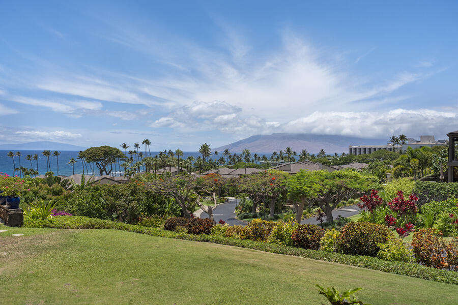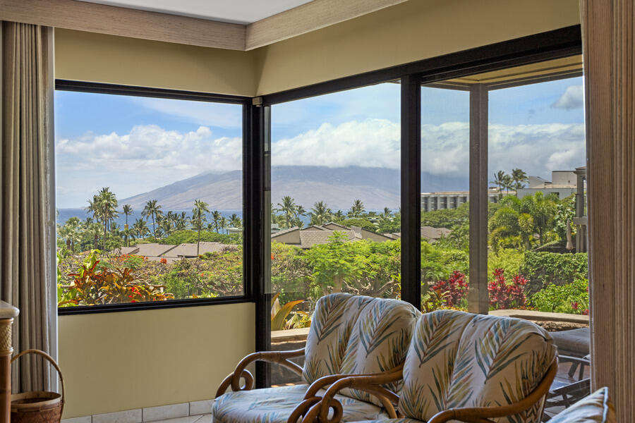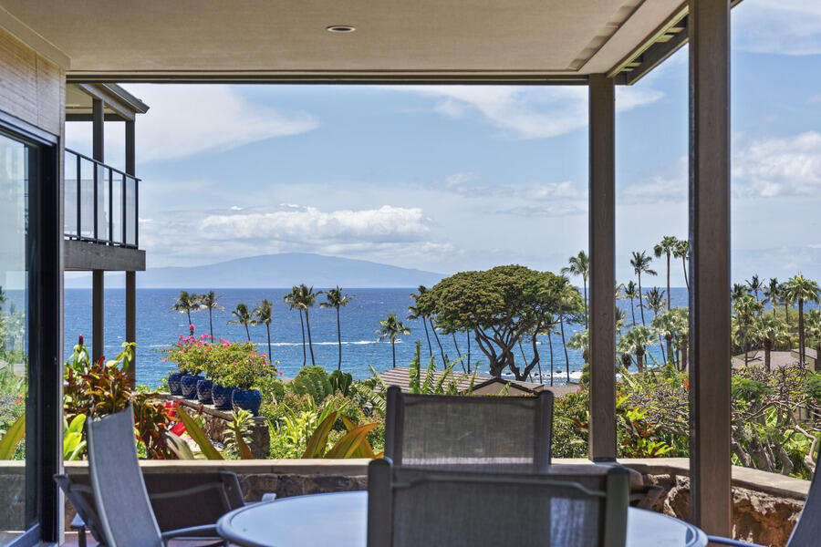 Our large lanai, living room, and master bedroom are ocean-facing, with a spectacular panorama of ocean and the West Maui Mountains framed by plumeria, bougainvillea, and palm trees. From this home, you have the magical experience of listening to the birds singing in the morning, enjoying the play of the whales in the ocean, or watching the brilliant sunsets reflecting on the ocean through silhouetted palm trees.
