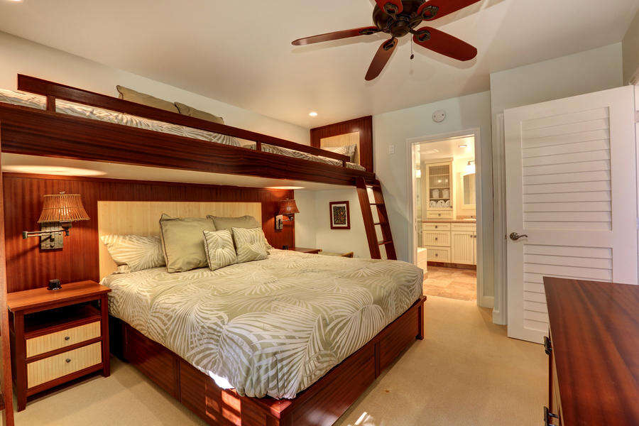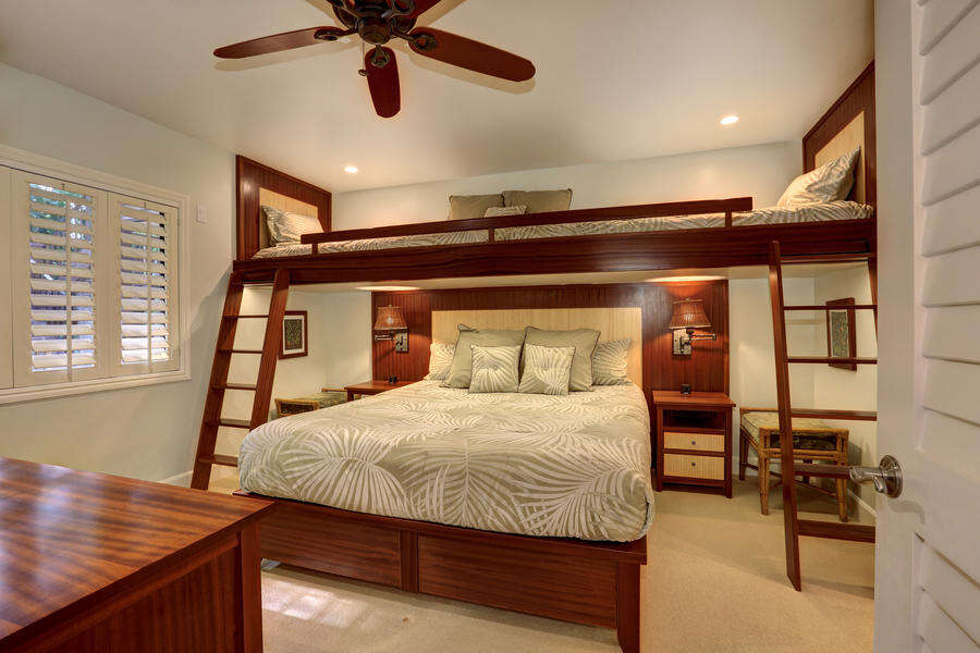 Guest Bedroom: California King bed plus custom-built loft with two extra-long twin beds.