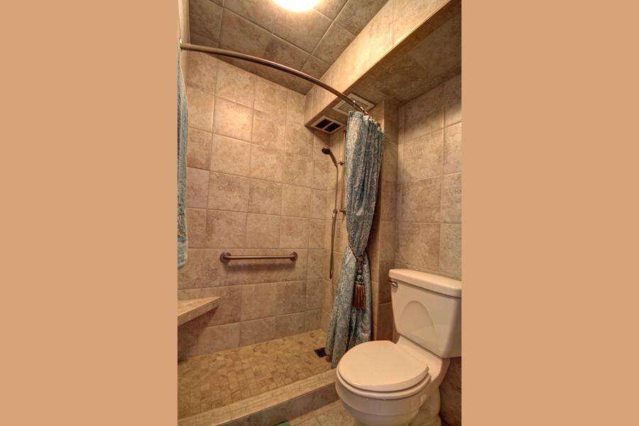 â˘Full tile shower with adjustable shower head and footrest