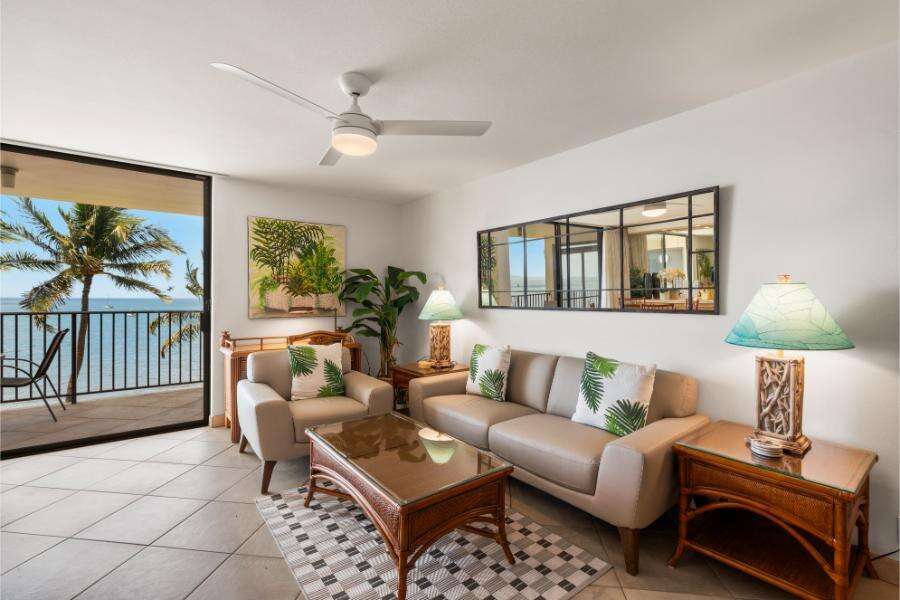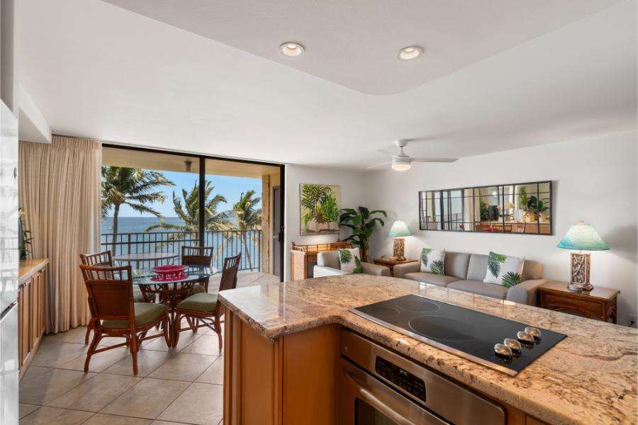 Discover the exquisite features of Unit #603 that elevate your beachfront getaway experience to new heights. This top floor waterfront suite boasts spacious terraces offering breathtaking ocean views. The open plan layout is accentuated by sandstone flooring and granite counters, creating a luxurious ambiance. The fully equipped kitchen provides convenience for preparing meals while enjoying the view. A special feature of this unit is the extra shared lanai off the private lanai area, perfect for relaxing or entertaining while taking in the stunning surroundings. Whether sipping your morning coffee or watching the sunset, the spacious terraces of Unit #603 provide the ideal setting to unwind and soak in the beauty of the ocean just steps away.