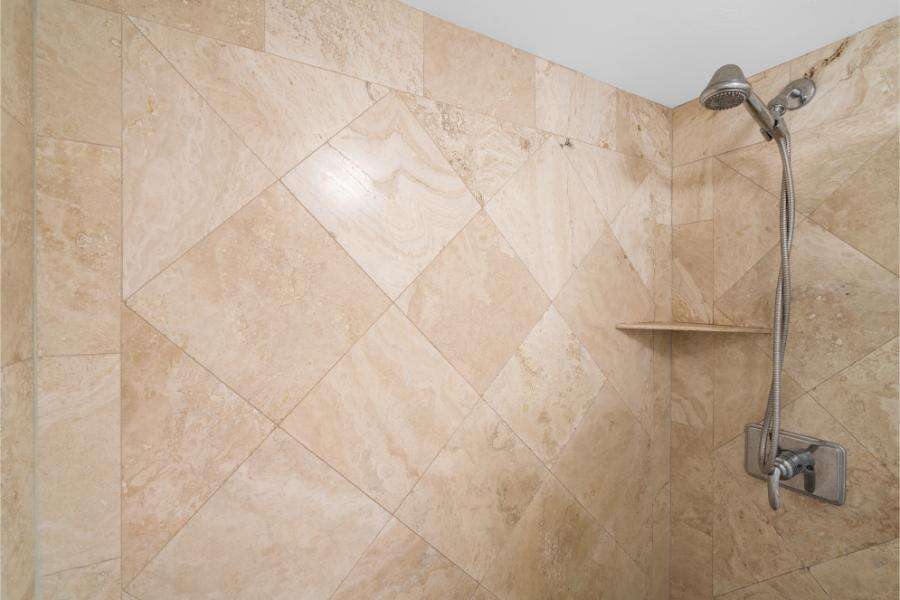 â˘Modern bathroom with tiled shower, granite vanity, and new cabinetry