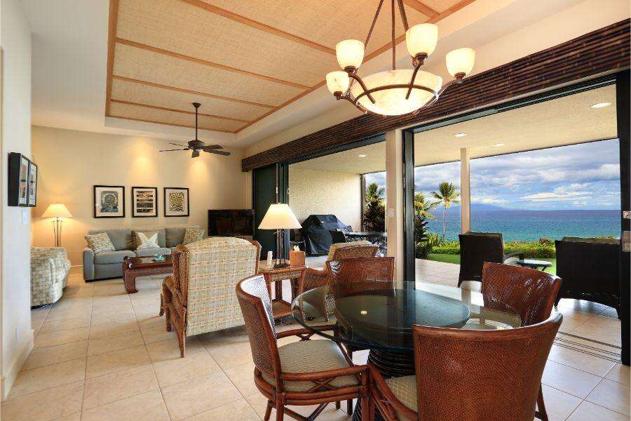 We fell in love with Maui and Makena Surf, so after a few more visits, we bought our condo. We chose C106 for several reasons. There are no stairs to get into the unit and only two steps inside the unit. It has an expansive, unobstructed view of the ocean, Lanai, and West Maui. We also happen to have an archeological site just beyond our lanai and lawn. It’s called a Heiau, which is an ancient sacred site. Because no one is allowed on the Heiau, our lanai and lawn area is very private, yet steps away from the beach.