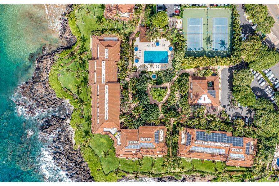 Makena Surf Resort, located in the exclusive Makena area, offers a secluded beachfront retreat surrounded by lush tropical landscaping. This gated property features six two- and three-story buildings, each designed to maximize stunning views of the Pacific Ocean. The pristine beach and rocky shoreline in front of the resort create the perfect backdrop for sunsets, swimming, sunbathing, and seasonal whale watching.