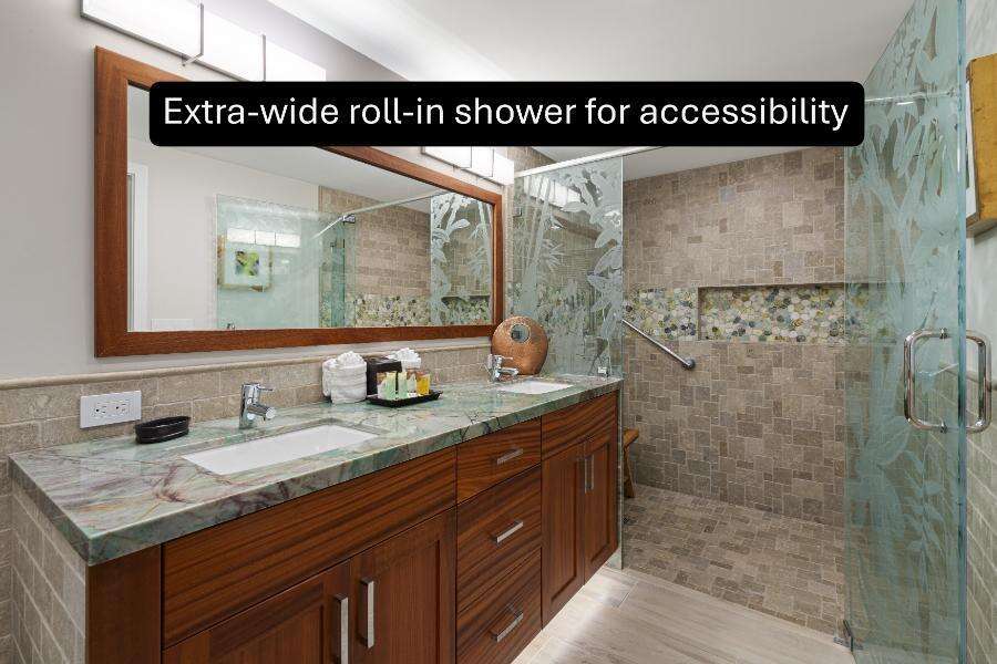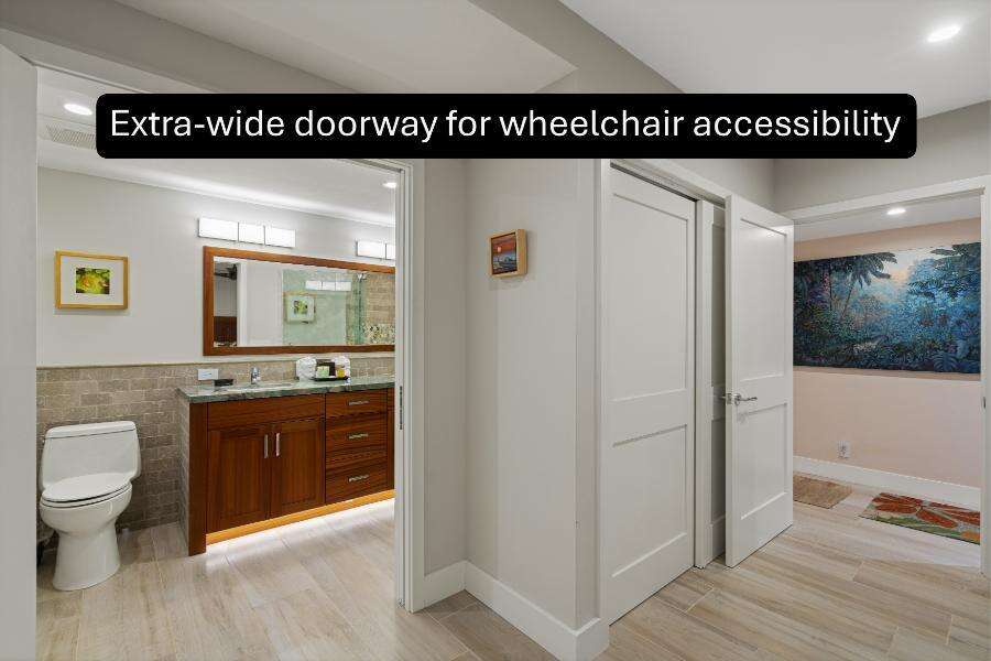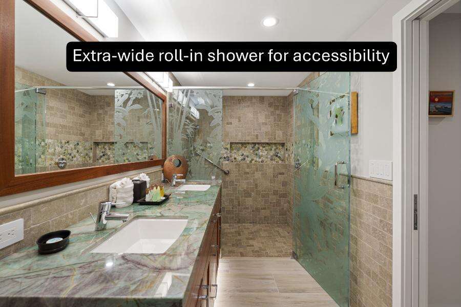 Accessibility was top of mind during the recent remodel, with thoughtful enhancements to support comfort and ease of movement as we age. Features include a no-stairs path to the front door, extra-wide door thresholds, roll-in showers, wide passages through the kitchen, and load-bearing toilet paper holders to assist with lifting and balance.