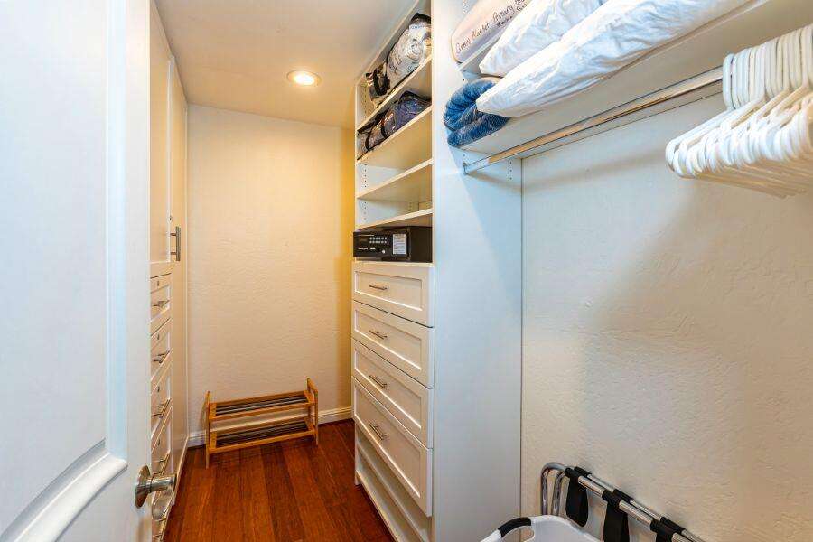 •Primary bedroom with designer king bed, flat-screen TV, sound machine, ceiling fan, desk area, and custom walk-in closet with safe