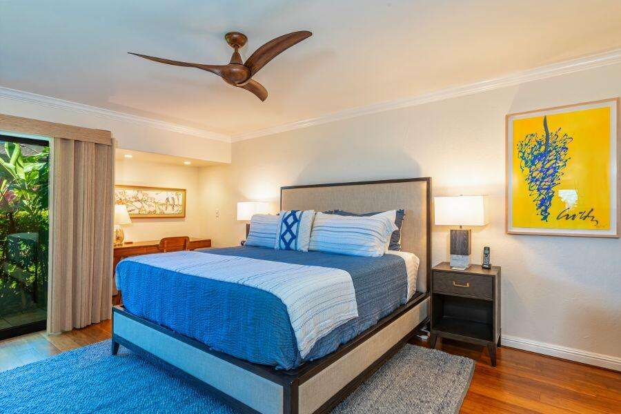 Enhance your stay at Wailea Elua #0305 with the luxurious bedroom features and comforts that await you in this exclusive beachfront condo in Wailea, Hawaii. The primary bedroom boasts a designer king bed for maximum sleep quality, a flat-screen TV for entertainment, and a private desk area. Additionally, you'll find a custom walk-in closet with a safe for your valuables. The guest bedroom offers a new queen mattress, another flat-screen TV, and a slider to the lanai for a relaxation space with a tropical view. Both bedrooms come with extra pillows, blankets, and luxury linens provided to guarantee your utmost comfort. Central air conditioning throughout the condo further enhances your relaxing retreat.