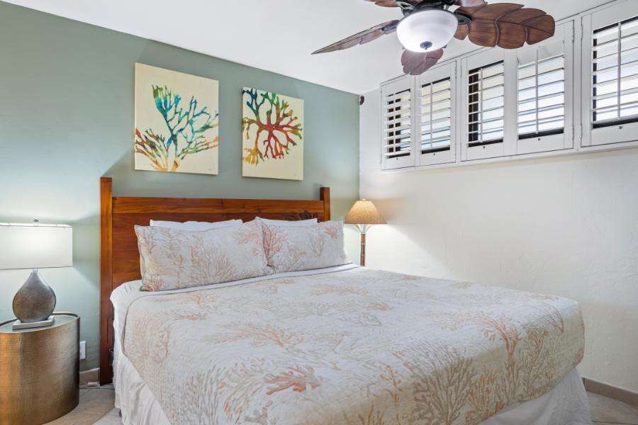 Inside, the spacious layout features a king bed in the master bedroom, a convertible sofa bed in the living room, and split duct air conditioning for consistent cooling throughout the unit. Ceiling fans in both the living room and bedroom help maintain a relaxing, tropical ambiance. Enjoy complimentary high-speed wireless internet and a private lanai for morning coffee or sunset unwinding.