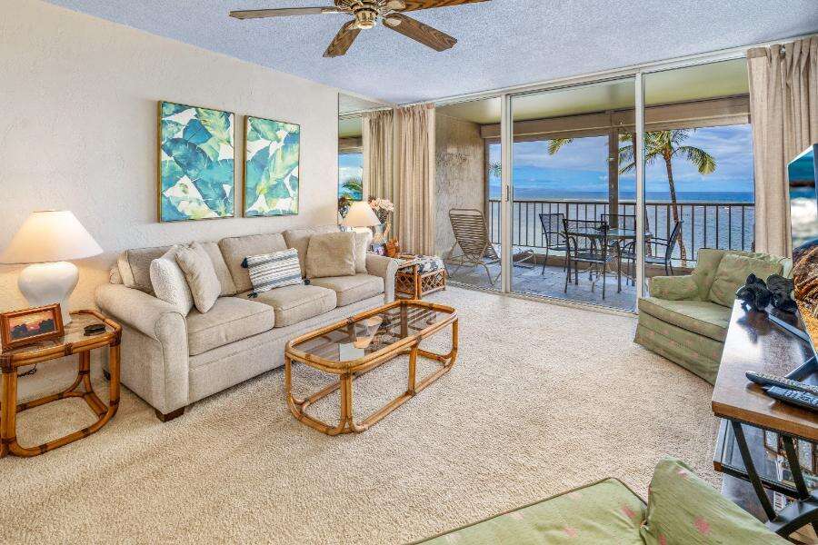 Welcome to Menehune Shores #517, a bright and inviting one-bedroom condo that offers stunning panoramic views of the Pacific Ocean and Mauiâs vibrant sunsets. Located on the 5th floor, this oceanfront retreat is perfect for couples or small families looking to relax in comfort while being just steps from the beach.