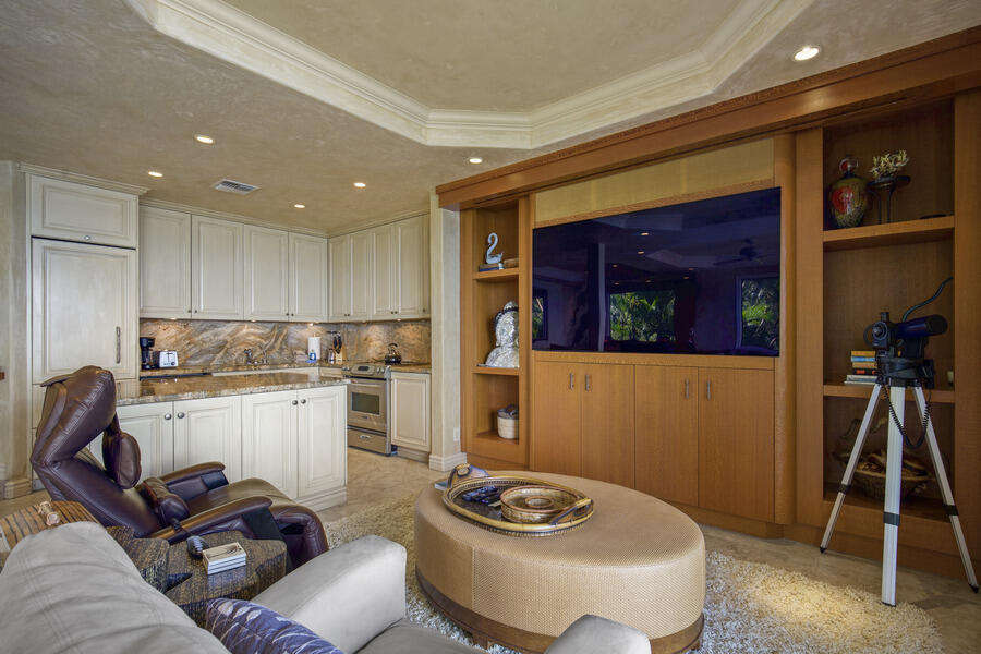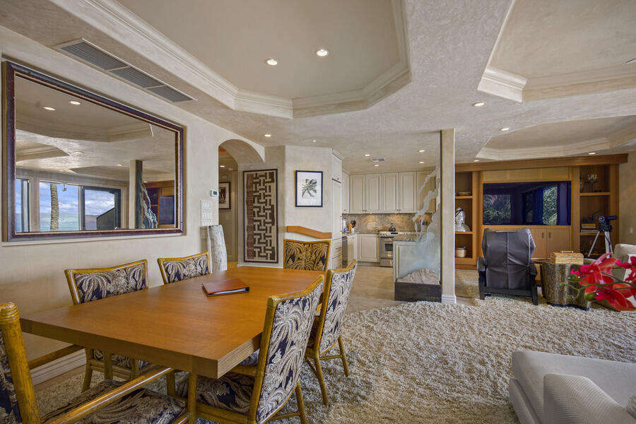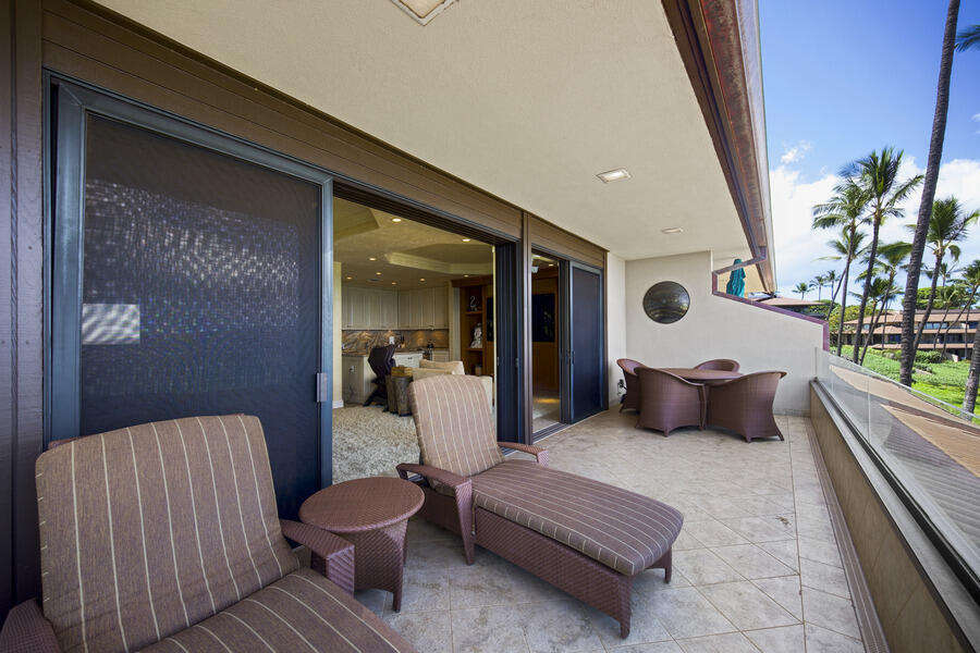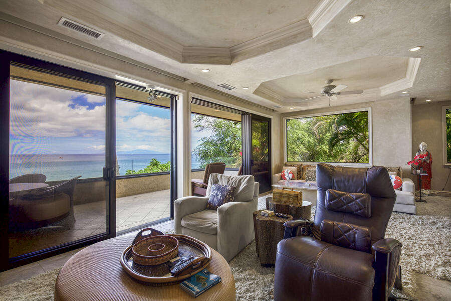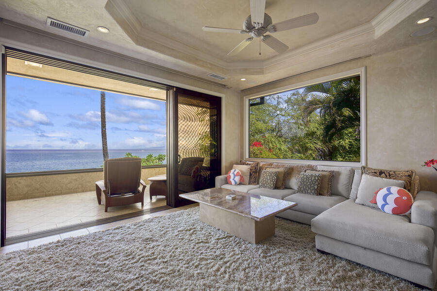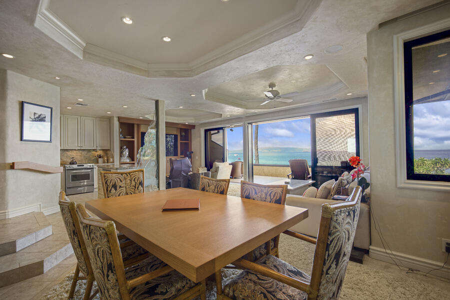 • Expansive Oceanfront Lanai: Unobstructed views of the ocean and Molokini Crater with outdoor dining and lounge seating.