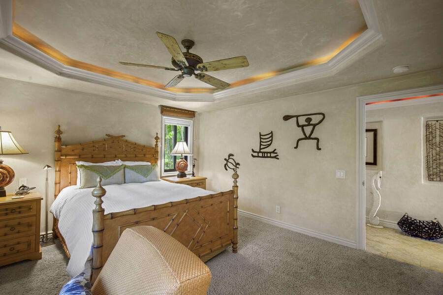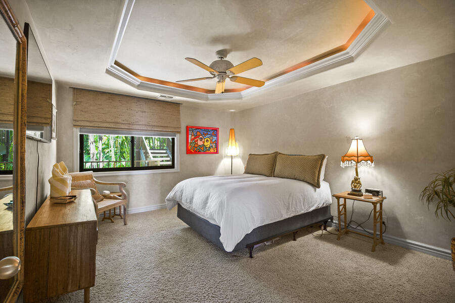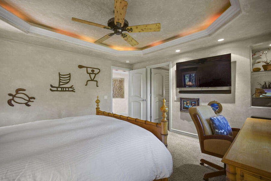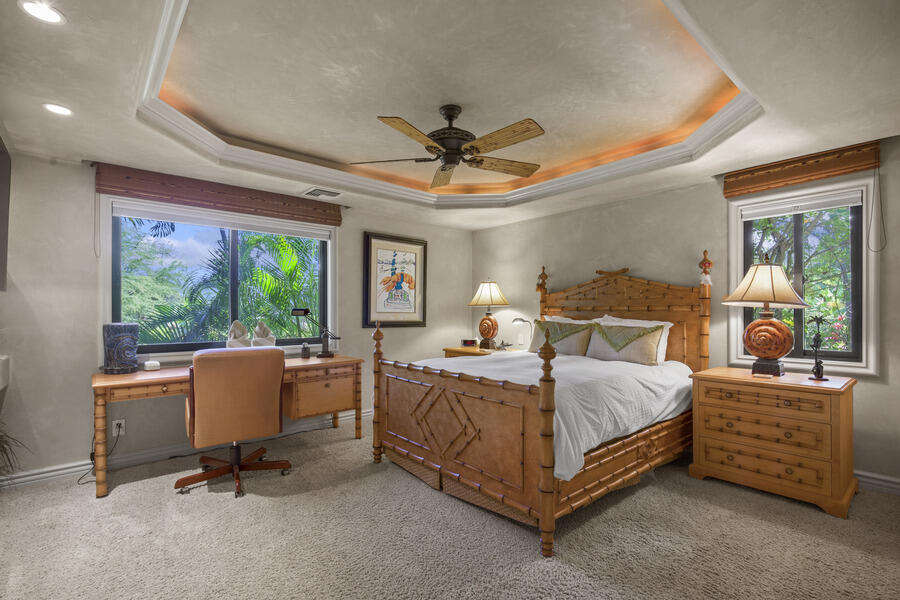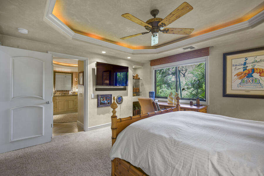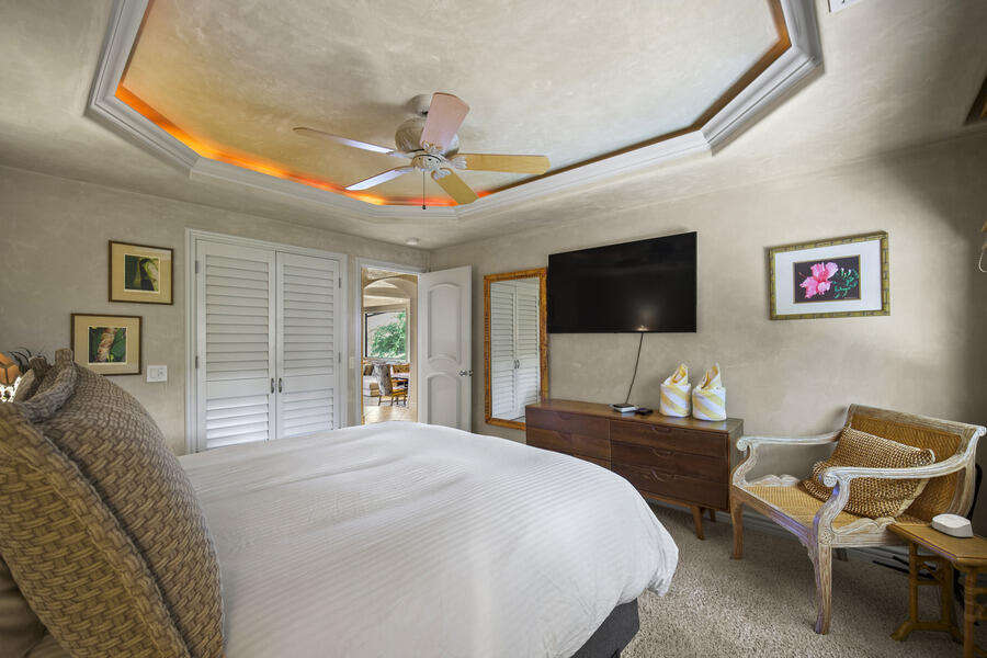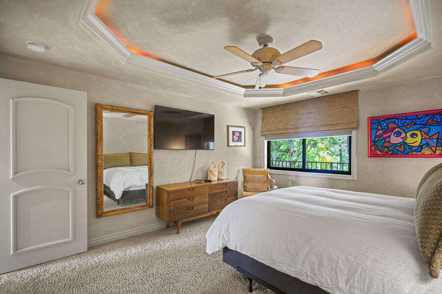 • Master Bedroom: Queen bed, garden view windows, ceiling fan, TV, and private workspace.