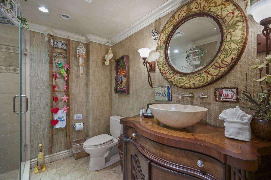 • Guest Bedroom: Queen bed with nearby full bathroom.