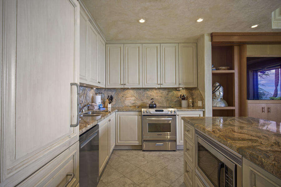 Makena Surf B-208 includes a fully stocked kitchen, washer and dryer, luxury linens, beach towels, and beach chairs. You’ll also enjoy complimentary local phone service and free high-speed internet.