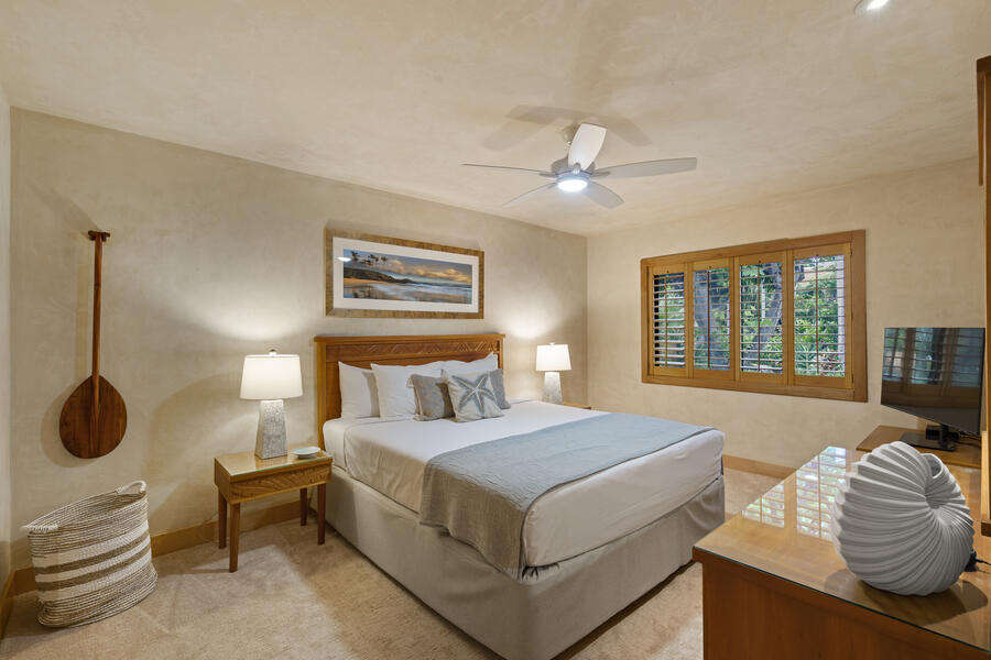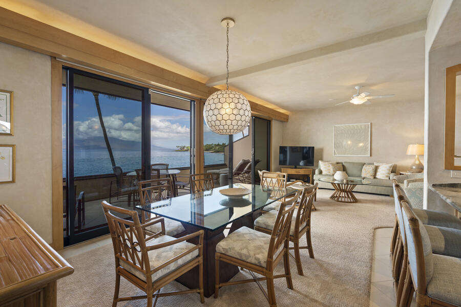 Inside, the open layout flows seamlessly from the fully equipped kitchen to the dining and living areas, all designed with comfort and style in mind. Large glass doors open to the lanai, where the sights and sounds of the ocean create the perfect backdrop for morning coffee or evening cocktails. The master suite features a plush king bed and en-suite bathroom, while the guest bedroom offers two twin beds that can also be joined to create a king—an ideal setup for both families and couples.