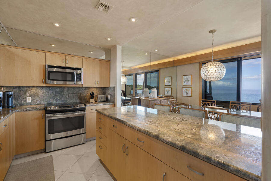 •Open-concept living, dining, and kitchen area with spectacular ocean views