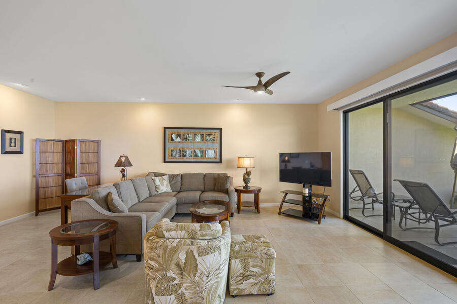 •Open-concept living and dining area with island-inspired décor