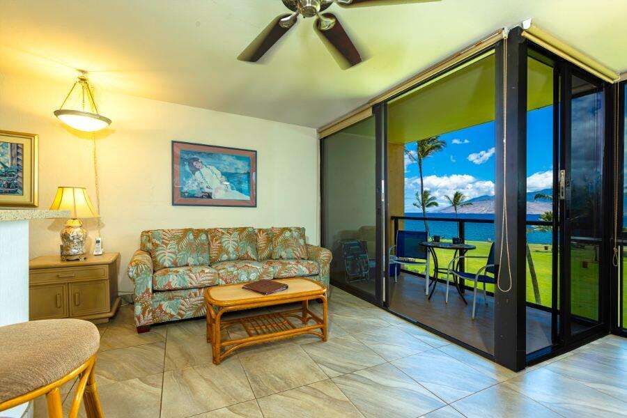 Oceanfront 1-bedroom condo rental in Kihei with split-duct AC, king bed, sofa sleeper, and a private lanai; a quiet vacation rental place to stay.