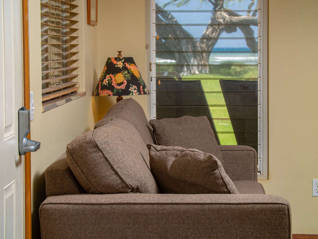 Tranquil Beachfront Estate w/ 5 Luxurious Private Full Suites & Exotic Fruit Grove. Full amenities. Our luxury Beachfront estate has 4 beachfront one-bedroom suites and a garden view two-bedroom Ohana. Each suite has a private entrance, separate living room, full kitchen and is like having your own condo at the beach in Maui. This special place is hidden behind a private, double gated entrance, lined with 700 ft of lighted coconut palms that lure you into the feeling of leaving the world behind. But is still centrally placed in Kihei nearly all of the amenities you might desire. The Aloha AKU Hula Suite sits closest to the La’ie wetlands. Enter through your private door and enjoy the soothing colors and local art commemorating the Hula tradition of Hawaii. Drop your bags, put on some Hawaiian music, and kick-back and begin your amazing stay. Pull open the glass slider and step onto your private lanai. Sit down and enjoy the ocean view across the beautiful grassy area or maybe grab a glass of wine and head down toward the beach for a sunset experience. Maui is calling you. The total number of guests shall be limited to up two (2) adult guests and up to two (2) minor guests per bedroom. As we are an adult-centric property pre-approval for minors 13 years old or younger is required before booking. Your e-arrival/text packet will be sent 7 days before you arrive on property. We may be offsite so to ensure that you can get in please REVIEW the easy to follow driving directions, parking and self-check-in instructions (including entry codes and amenities). Central Kihei