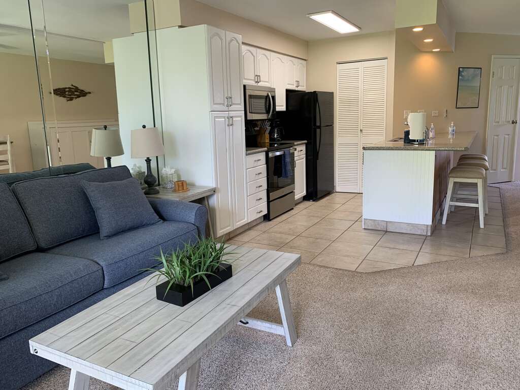 Oceanfront Resort Condo Suite - ground floor tastefully-updated with all new furniture (April 2022) 1-Bedroom 2-bath with King Bed, Queen Sleeper & Twin Murphy bed in LR. Family Friendly, sleeps up to 5, Full Kitchen, AC, Washer/Dryer in-suite, Free WIFI & Parking, Cable/Flat Screen TV, Private covered lanai, pool, tennis, BBQs. Easy self-check-in, complex centrally located, near shopping, restaurants, nice beach out front of complex. The Aloha Tai Suite is one of the members of the Aloha Aku rental family. Located at the fabulous Maui Sunset Resort Condo complex it offers the traveler looking for the resort condo experience a generous balance of reasonable cost and access to large resort amenities. Maui Sunset Resort - 1032 S. Kihei Road, Suite B102, Kihei, HI 96753