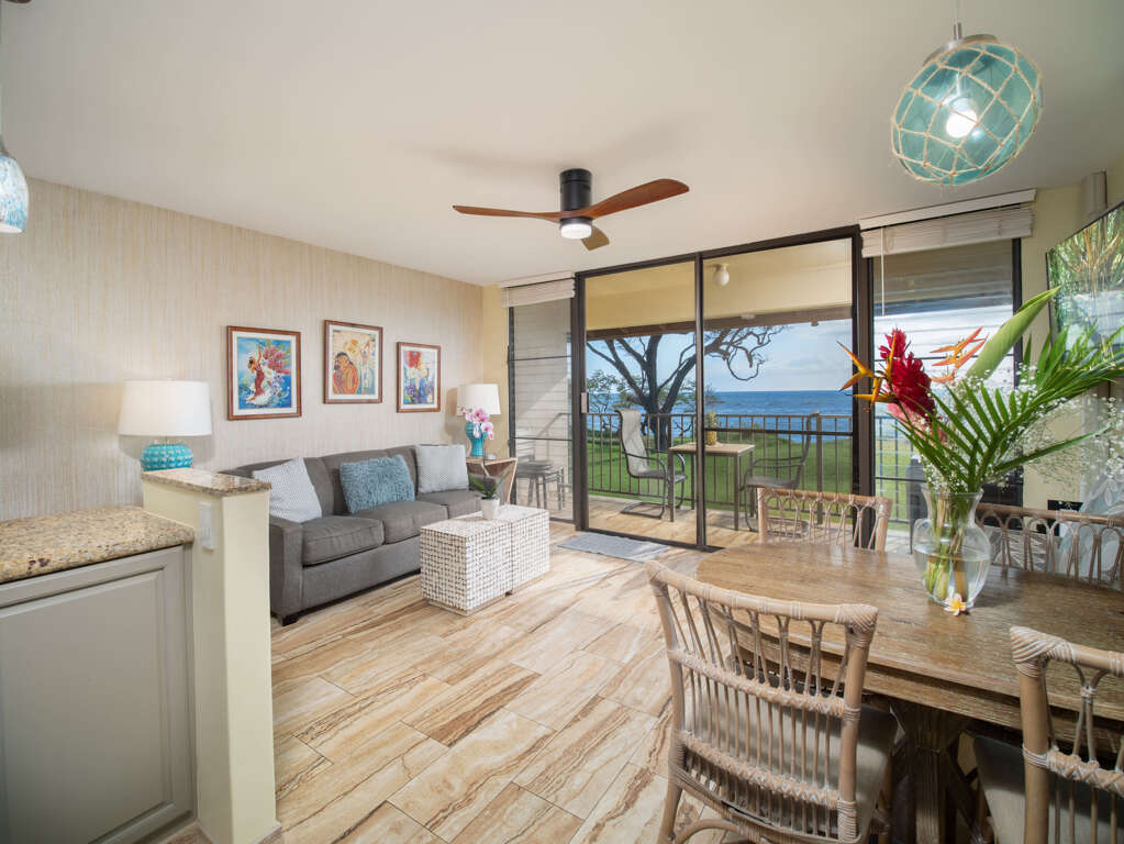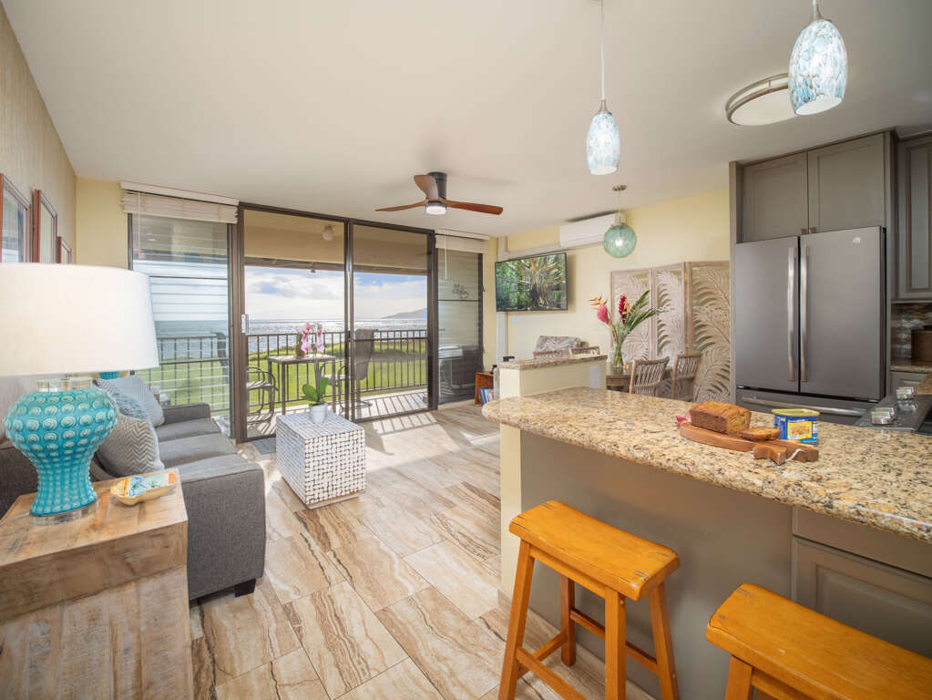 This family-friendly remodeled beachfront, second floor 1-bedroom/1-bath air-conditioned Condo Suite comes with a comfortable king-size bed and living room couch that pulls out to a queen size sofa-sleeper allowing the unit to sleep up to 4 people. Just steps from the beach, the awe-inspiring multi-island views from the shore are unlike any other. You can enjoy this gorgeous view from your covered lanai. Gorgeous granite counter tops in the kitchen and bathroom along with new appliances and fixtures offer comforts and luxury. We invite you to experience a piece of paradise at the Aloha La'i Suite, part of the Aloha Aku Rentals family. "Aloha La’i" (pronounced La-ee) in Hawaiian embodies tranquility, calm, and the serene connection between nature and the elements. Our hope is that during your stay, you'll find the perfect blend of relaxation and adventure. Your e-arrival/text packet will be sent 7 days before you arrive on property. We may be offsite so to ensure that you can get in please REVIEW the easy to follow driving directions, parking and self-check-in instructions (including entry codes and amenities).