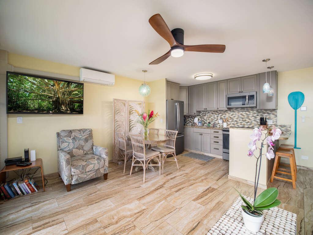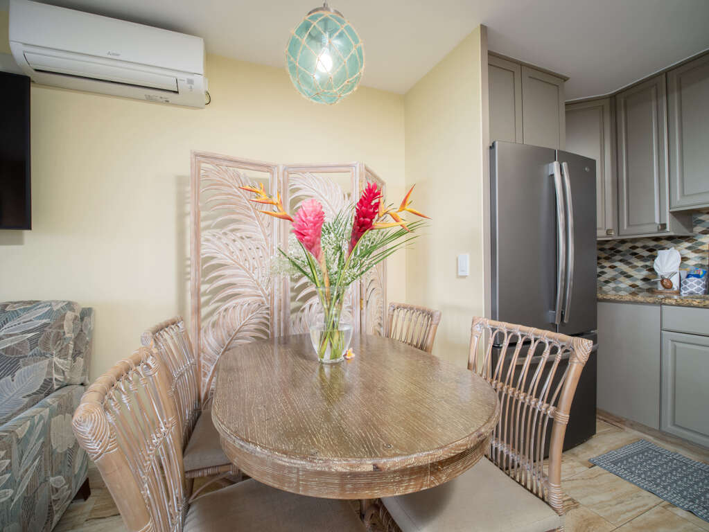 The Aloha La'i Suite is a large, remodeled second-floor condo featuring one bedroom with a king bed, a convertible queen sofa bed, and one bathroom, accommodating up to four guests. The private beachfront lanai offers stunning ocean views, and the unit comes equipped with air conditioning, a flat-screen TV, high-speed WiFi, and a fully stocked kitchen. We provide all necessary linens, including bath and beach towels, to ensure your stay is comfortable and convenient.