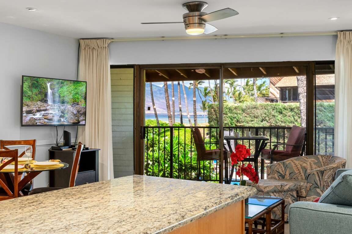 Our second-floor condo, the Aloha Ola Suite, features a 1-bedroom setup with a King bed, a convertible Queen sofa bed, and 1 bath, accommodating up to four guests. Enjoy the luxury of a private beachfront lanai, an Olympic-sized swimming pool, and modern amenities such as air conditioning, a flat-screen TV, high-speed WiFi, and more. The glimmering 60' x 25' solar-heated swimming pool is perfect for both relaxation and a good workout. Other beachfront amenities include BBQs, picnic tables, shuffleboard, a tropical garden area with a waterfall feature, and more