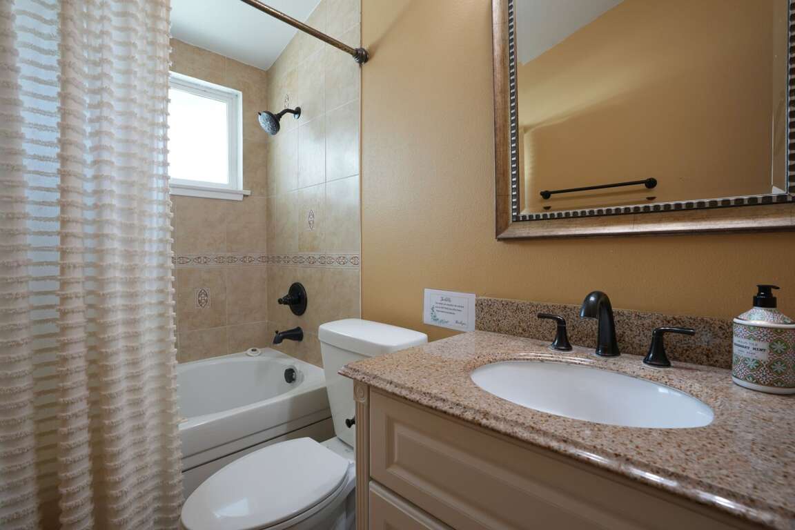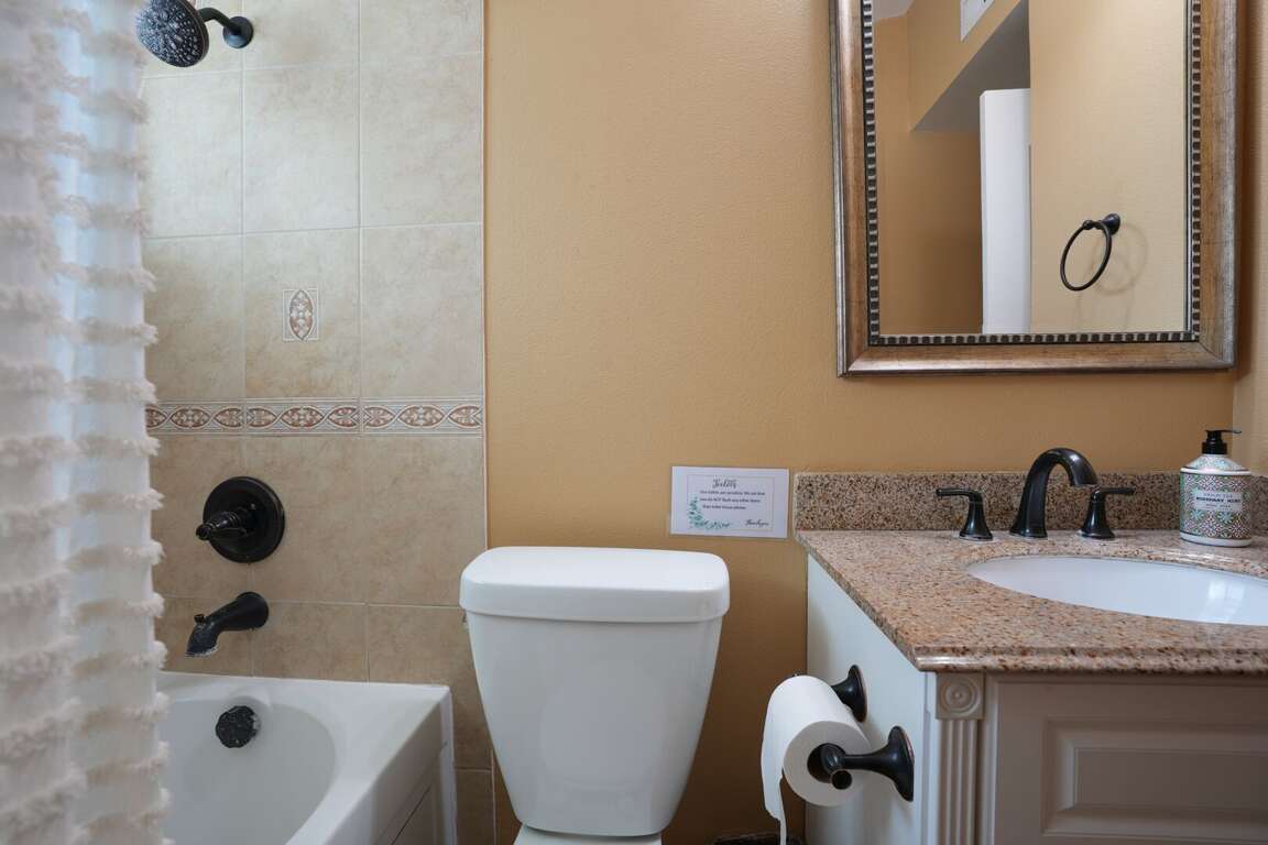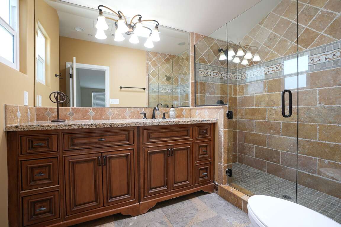 The home has three bathrooms. Two are on the first floor and one is on the second. All three bathrooms feature upgraded granite countertops, travertine floors, and custom tile inlays. The downstairs hallway bathroom has a bathtub/shower combo.