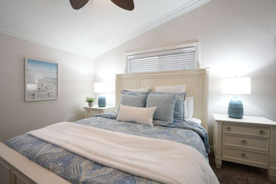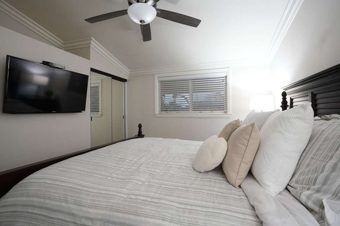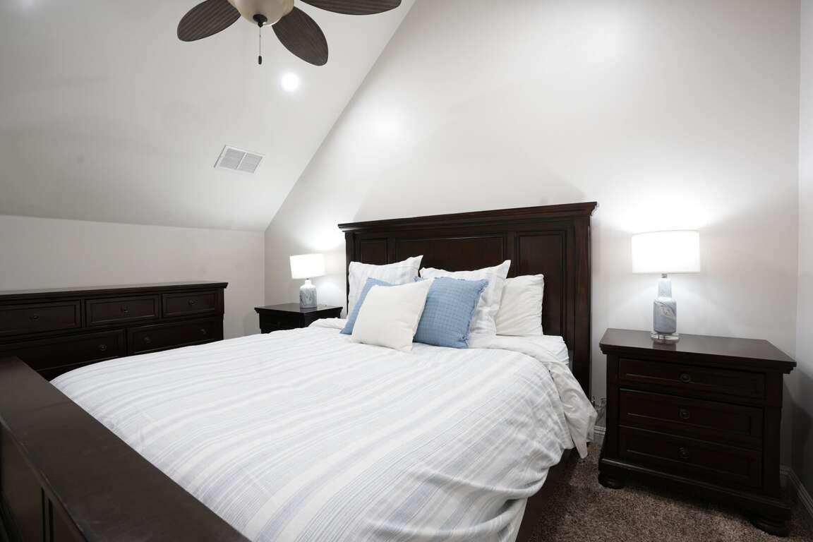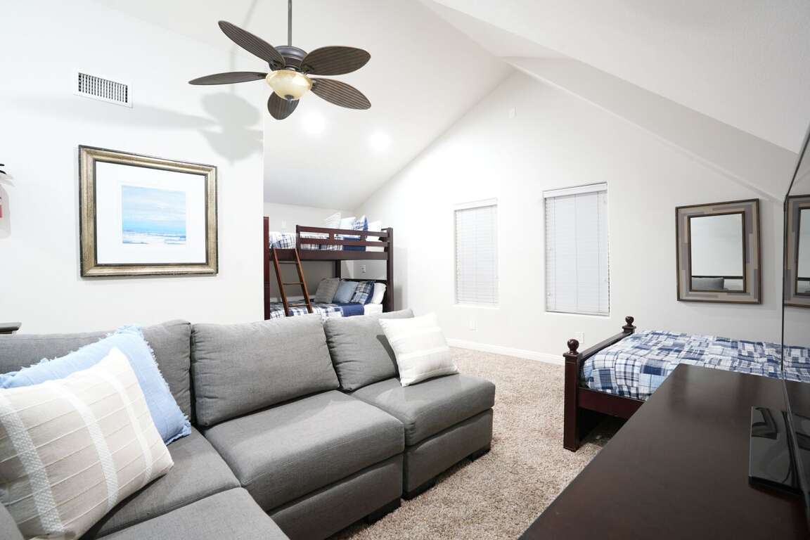 There are three master bedroom and two children's bedrooms with full-overfull bunk beds. Three bedrooms are located in the main floor: a cal-king master bedroom, a cal-king master with ensuite and a children’s bunk room. The cal-king bedroom and the bunkbeds are located on the main level, sharing a hallway bathroom. The other master bedroom is located upstairs with direct access to the upstairs hallway bathroom. The loft houses the other children's bedrooms. The full-over full bunk bed is accompanied by a sectional couch and a full-size bed. All bedrooms have a 43" LCD television.
