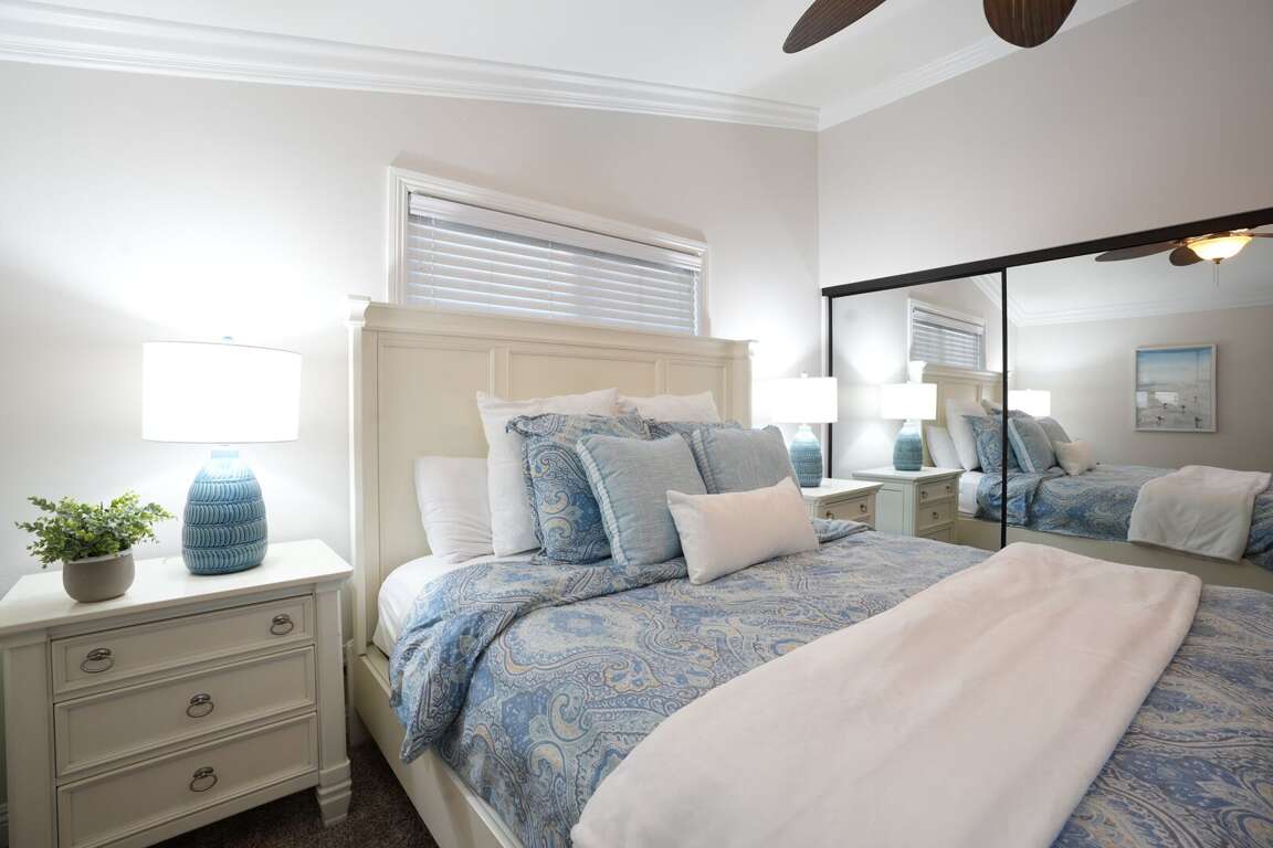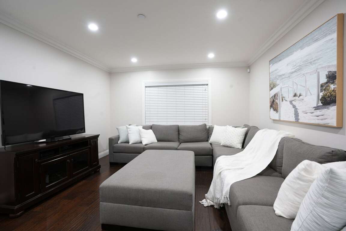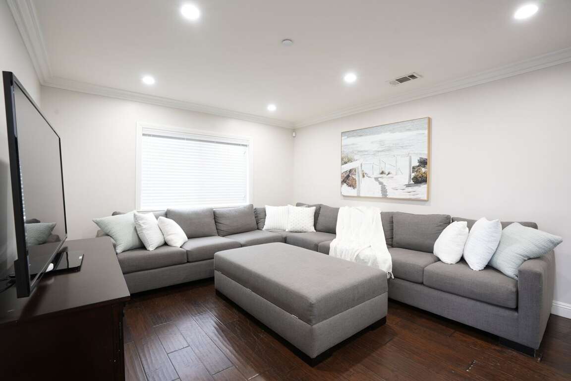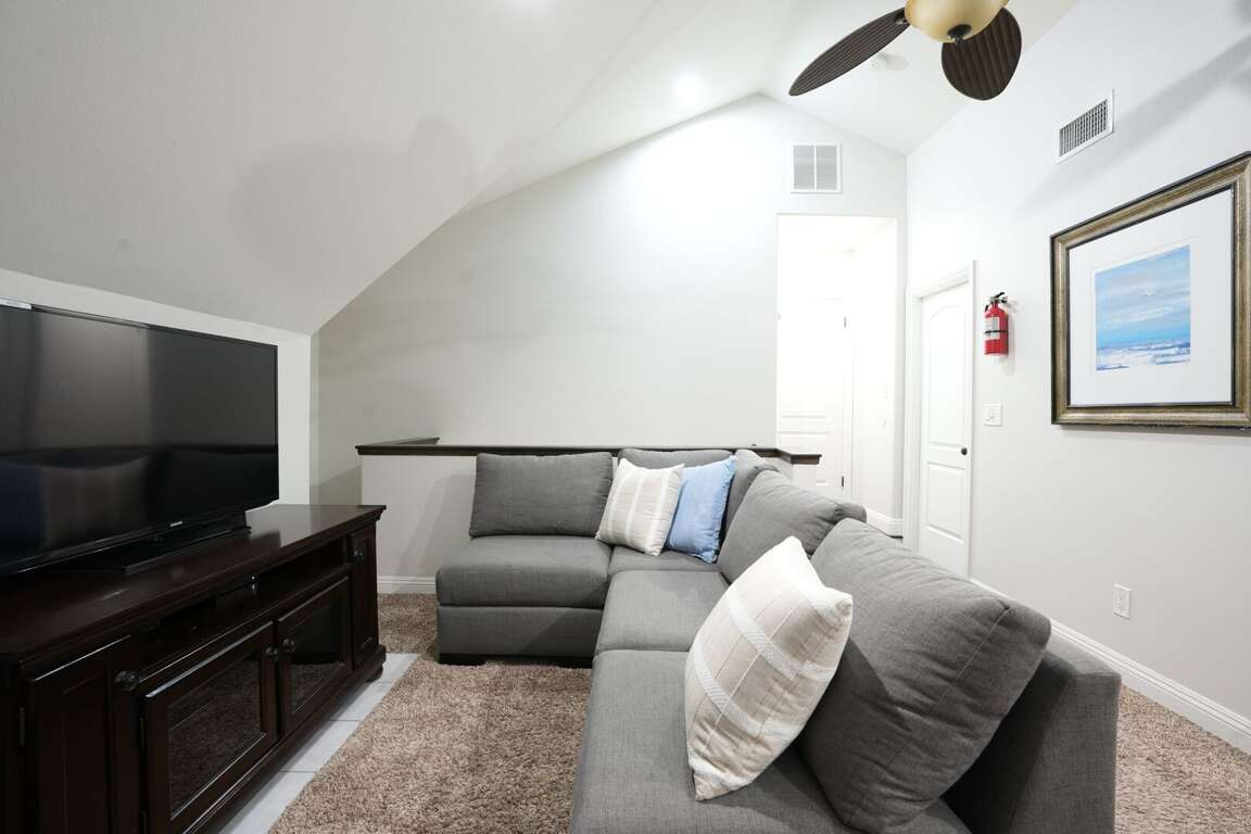 The kitchen is spacious with granite countertops, white custom-paneled cabinets and stainless steel appliances, including a stove/oven, dishwasher, refrigerator and microwave. Two dining tables with six seats each provide enough space for the whole family. The kitchen counter has additional seating. The main living room has a large sectional couch with a queen-size bed and high-speed wireless internet.