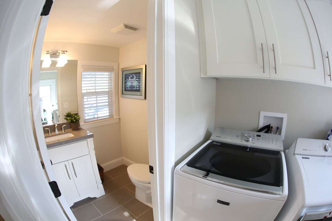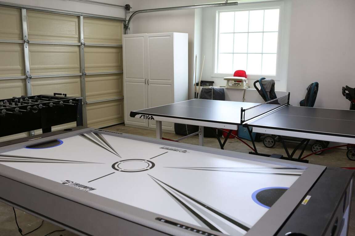 Just off the kitchen, you will find the washer and dryer for guests as well as the half-bath. The game room is located in the garage. The game room includes a foosball table, an air hockey table and a ping-pong. High chairs, pack-n'-plays, boosters, and strollers are available for infants and children.